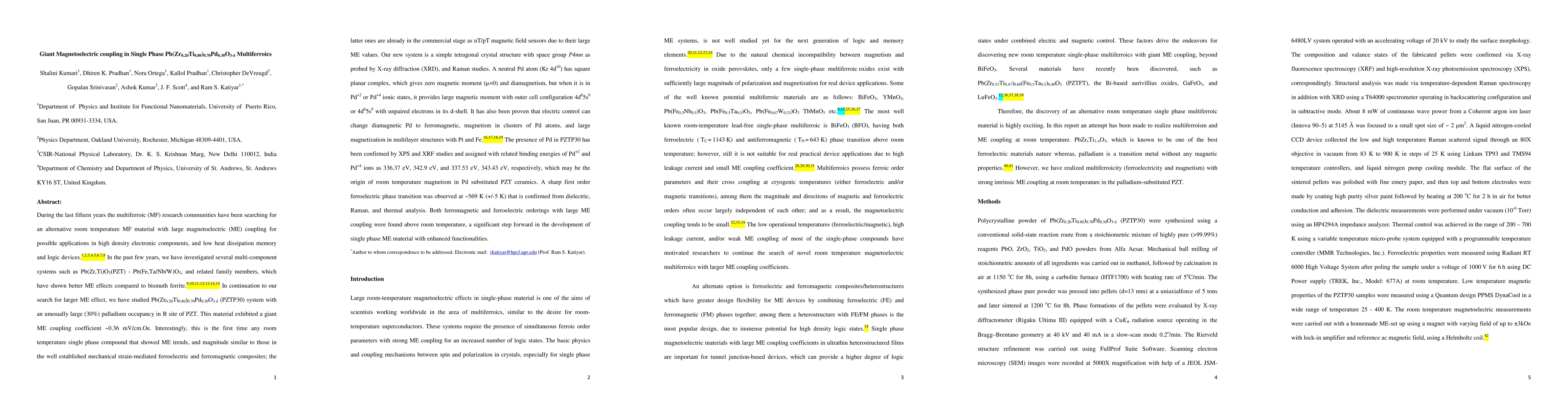 This paper reports on Pb(Zr0.20Ti0.80)0.70Pd0.30O3-{\delta} (PZTP30), a single phase multiferroic material exhibiting giant magnetoelectric coupling (~0.36 mV/cm.Oe) at room temperature, comparable to established composites, marking a significant step forward in the development of multifunctional electronic components.