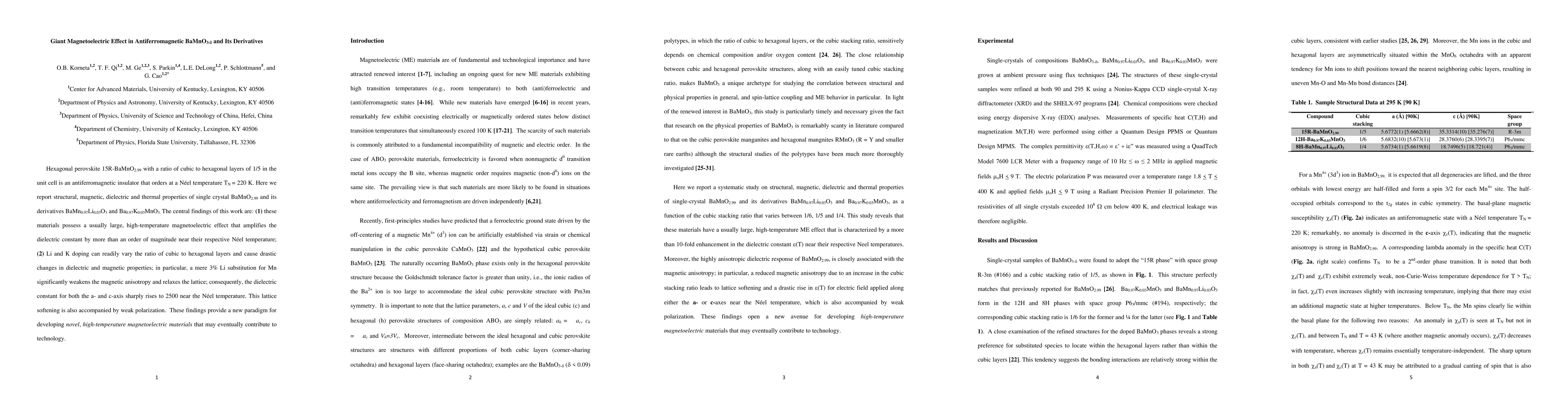 Hexagonal perovskite 15R-BaMnO2.99 with a ratio of cubic to hexagonal layers of 1/5 in the unit cell is an antiferromagnetic insulator that orders at a N\'eel temperature TN = 220 K. Here we report structural, magnetic, dielectric and thermal properties of single crystal BaMnO2.99 and its derivatives BaMn0.97Li0.03O3 and Ba0.97K0.03MnO3. The central findings of this work are: (1) these materials possess a usually large, high-temperature magnetoelectric effect that amplifies the dielectric constant by more than an order of magnitude near their respective N\'eel temperature; (2) Li and K doping can readily vary the ratio of cubic to hexagonal layers and cause drastic changes in dielectric and magnetic properties; in particular, a mere 3% Li substitution for Mn significantly weakens the magnetic anisotropy and relaxes the lattice; consequently, the dielectric constant for both the a- and c-axis sharply rises to 2500 near the N\'eel temperature. This lattice softening is also accompanied by weak polarization. These findings provide a new paradigm for developing novel, high-temperature magnetoelectric materials that may eventually contribute to technology.