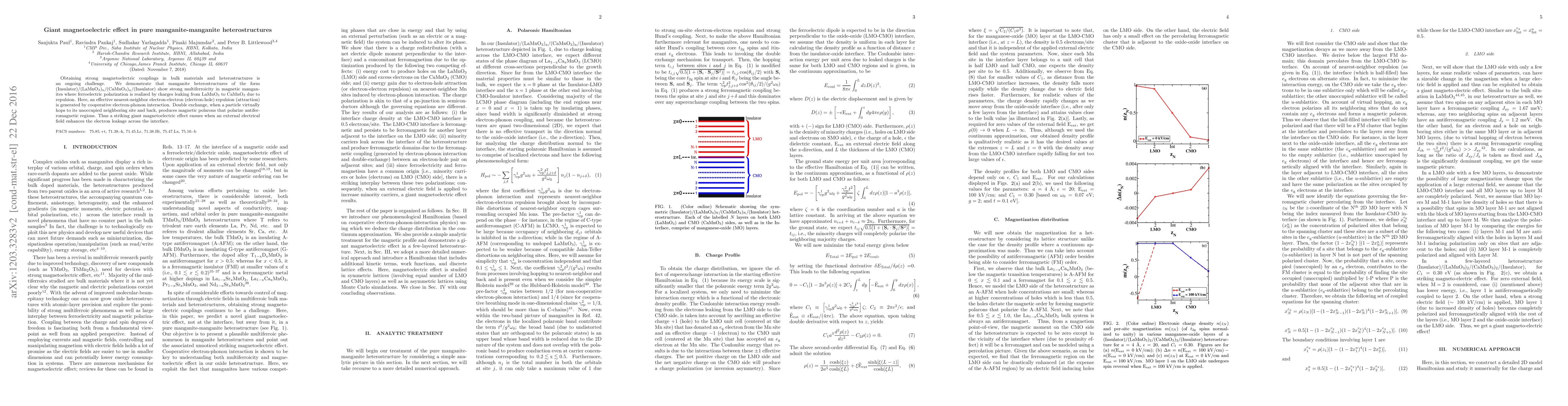 Obtaining strong magnetoelectric couplings in bulk materials and heterostructures is an ongoing challenge. We demonstrate that manganite heterostructures of the form ${\rm (Insulator)/(LaMnO_3)_n/(CaMnO_3)_n/(Insulator)}$ show strong multiferroicity in magnetic manganites where ferroelectric polarization is realized by charges leaking from ${\rm LaMnO_3}$ to ${\rm CaMnO_3}$ due to repulsion. Here, an effective nearest-neighbor electron-electron (electron-hole) repulsion (attraction) is generated by cooperative electron-phonon interaction. Double exchange, when a particle virtually hops to its unoccupied neighboring site and back, produces magnetic polarons that polarize antiferromagnetic regions. Thus a striking giant magnetoelectric effect ensues when an external electrical field enhances the electron leakage across the interface.