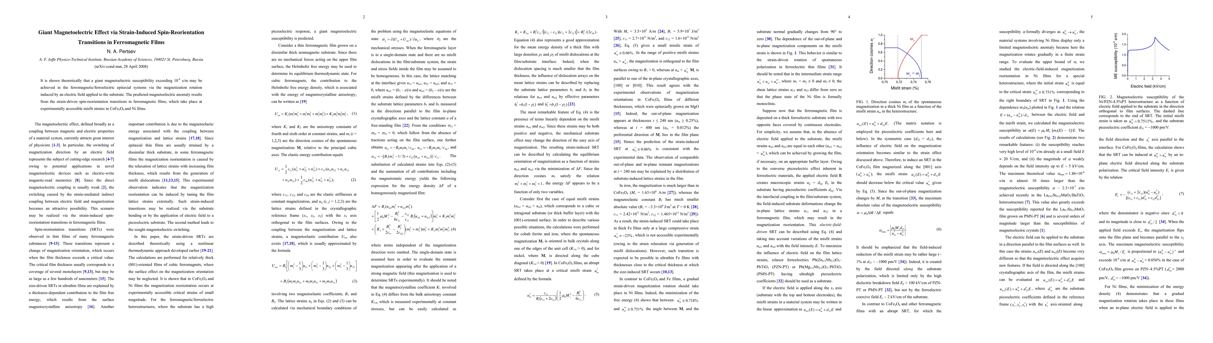 This paper theoretically demonstrates a giant magnetoelectric effect in ferromagnetic/ferroelectric epitaxial systems, achieving a susceptibility over 10^-6 s/m through strain-induced spin-reorientation transitions in films like CoFe2O4 and Ni, driven by substrate electric fields.