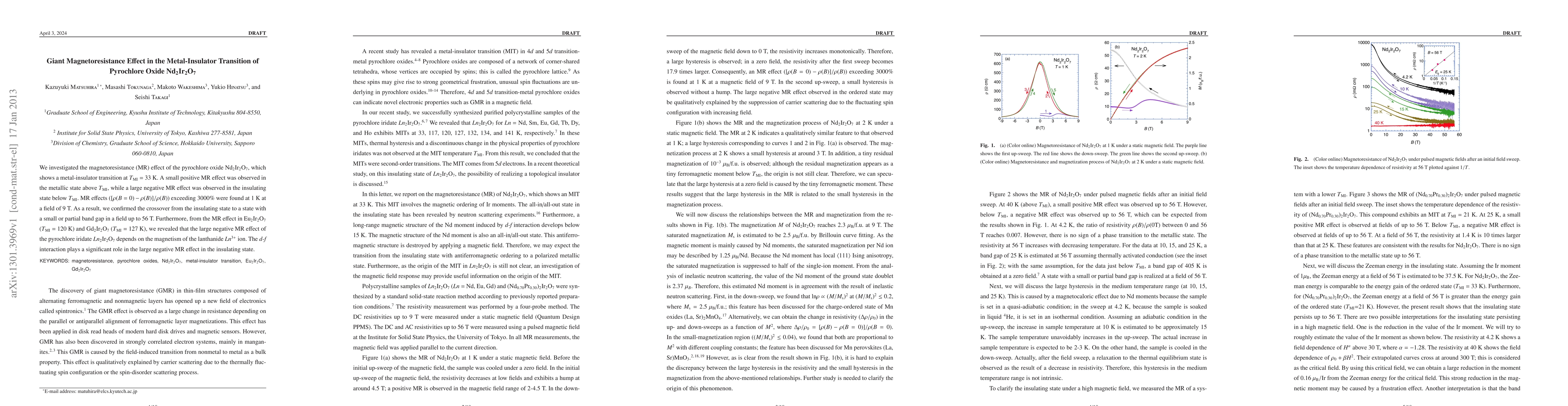 This study investigates the giant magnetoresistance effect in Nd2Ir2O7, revealing a large negative MR effect below its metal-insulator transition temperature of 33 K, and a small positive MR effect above it. The research highlights the influence of lanthanide magnetism on the MR effect, suggesting a significant role of d-f interactions in the insulating state.