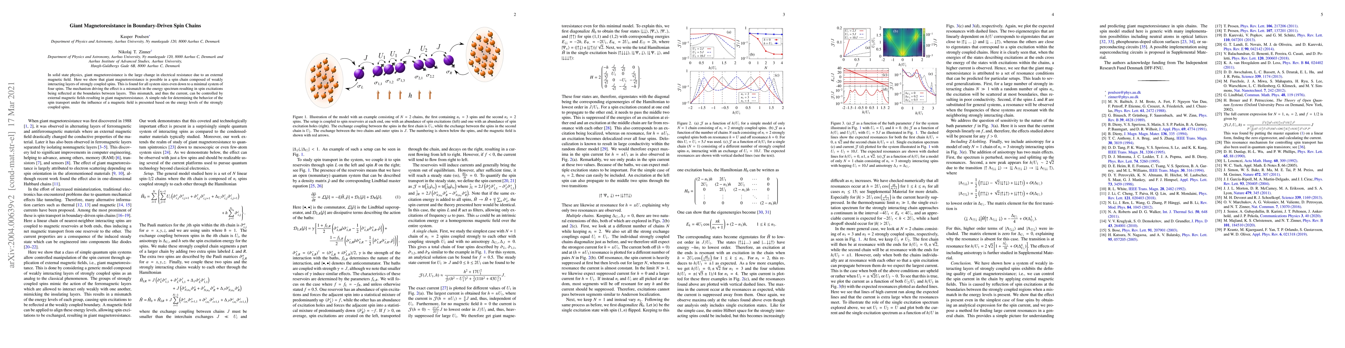 This paper demonstrates giant magnetoresistance in boundary-driven spin chains, showing that even minimal systems of four spins exhibit this phenomenon due to a mismatch in energy spectra causing reflected spin excitations at layer boundaries. The effect is controlled by external magnetic fields, with a simple rule provided for predicting spin transport behavior.