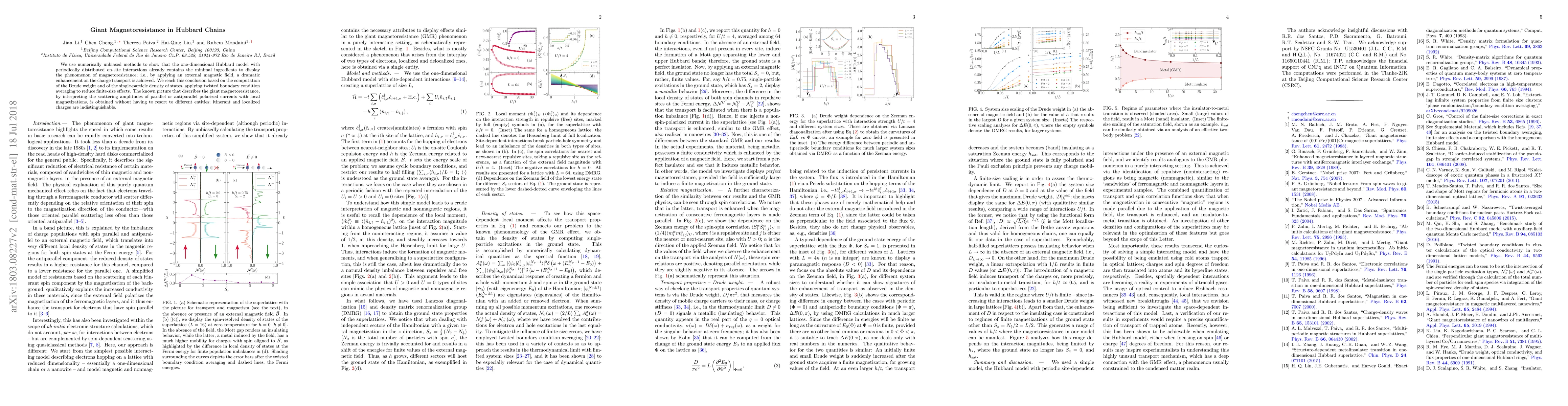 This paper demonstrates that the one-dimensional Hubbard model exhibits giant magnetoresistance through numerically unbiased methods, showing a significant enhancement in charge transport under an external magnetic field. The study concludes this by analyzing the Drude weight and single-particle density of states, revealing that both itinerant and localized charges contribute equally.