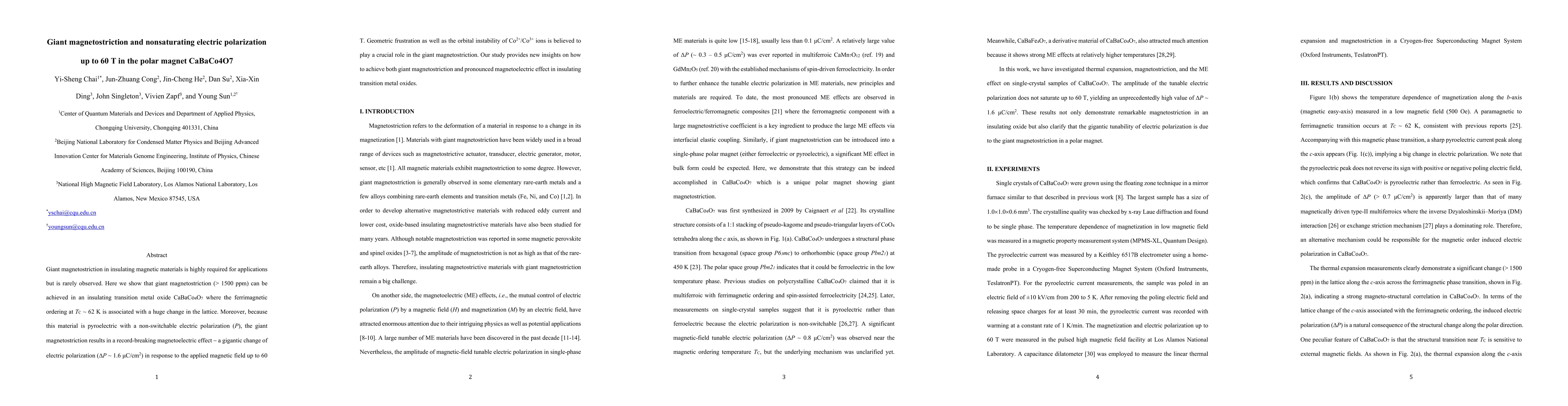 This paper reports the discovery of giant magnetostriction (> 1500 ppm) and a nonsaturating electric polarization up to 60 T in the insulating transition metal oxide CaBaCo4O7, revealing a record-breaking magnetoelectric effect and suggesting geometric frustration and orbital instability as key factors.