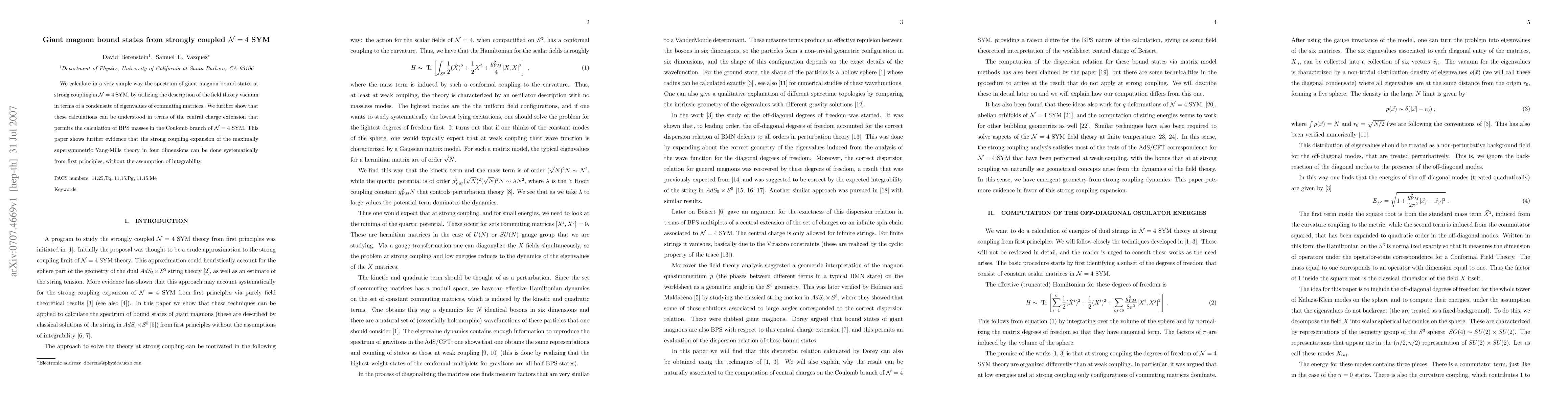 This paper calculates the spectrum of giant magnon bound states in strongly coupled N=4 SYM using a matrix model approach, demonstrating that these calculations can be understood through central charge extensions, providing systematic evidence for strong coupling expansions in the theory without relying on integrability assumptions.