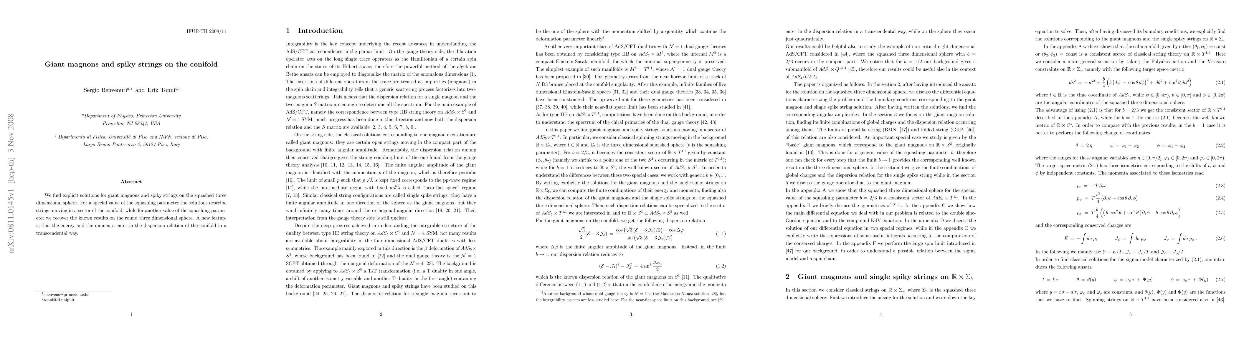 This paper presents explicit solutions for giant magnons and spiky strings on a squashed three-dimensional sphere, revealing new transcendental relations between energy, momenta, and dispersion in the conifold sector. The solutions also recover known results for strings on a round three-dimensional sphere under different squashing parameters.
