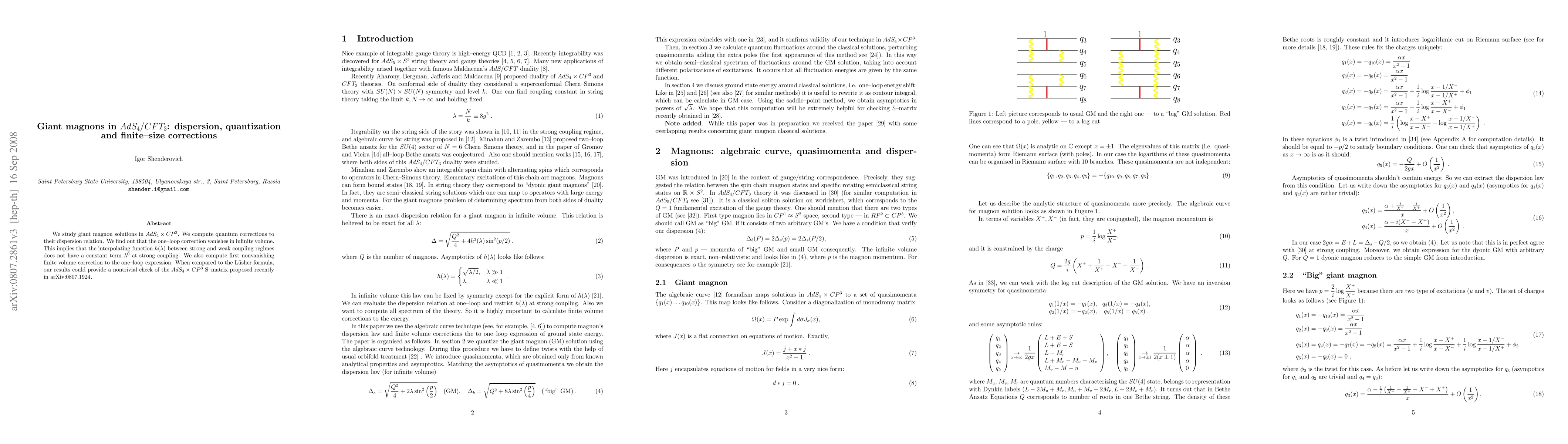 We study giant magnon solutions in AdS4 \times CP3. We compute quantum corrections to their dispersion relation. We find out that the one--loop correction vanishes in infinite volume. This implies that the interpolating function h(\lambda) between strong and weak coupling regimes does not have a constant term \lambda^0 at strong coupling. We also compute first nonvanishing finite volume correction to the one--loop expression. When compared to the L\"{u}sher formula, our results could provide a nontrivial check of the AdS4 \times CP3 S--matrix proposed recently in arXiv:0807.1924.