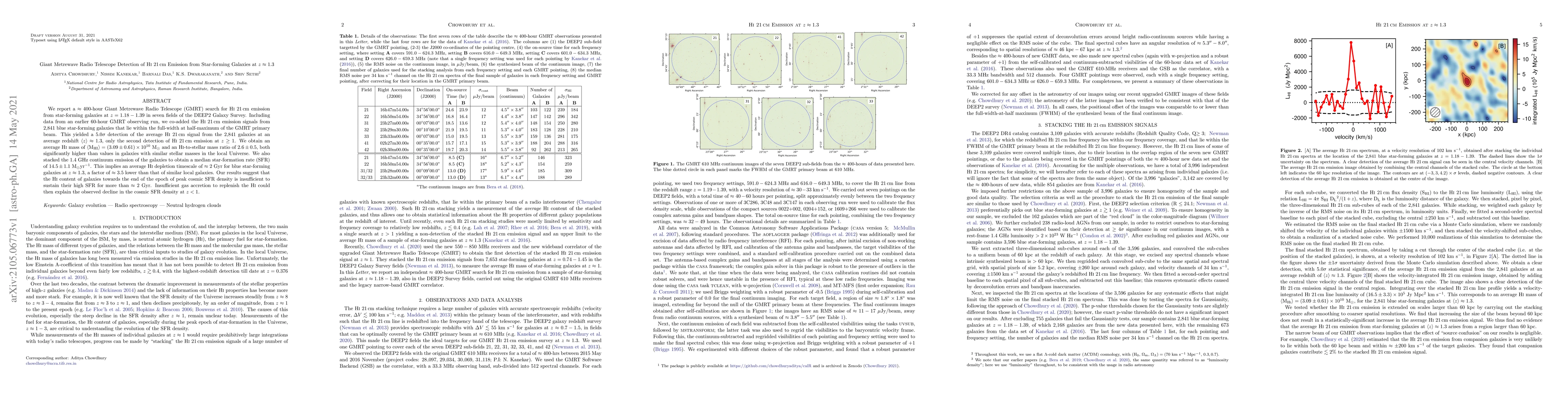 The Giant Metrewave Radio Telescope (GMRT) detected HI 21 cm emission from 2,841 star-forming galaxies at $z \approx 1.3$, yielding a $5.0\sigma$ signal and revealing an average HI mass significantly higher than local galaxies. The study suggests that insufficient gas replenishment limits the star-formation rate sustainability.