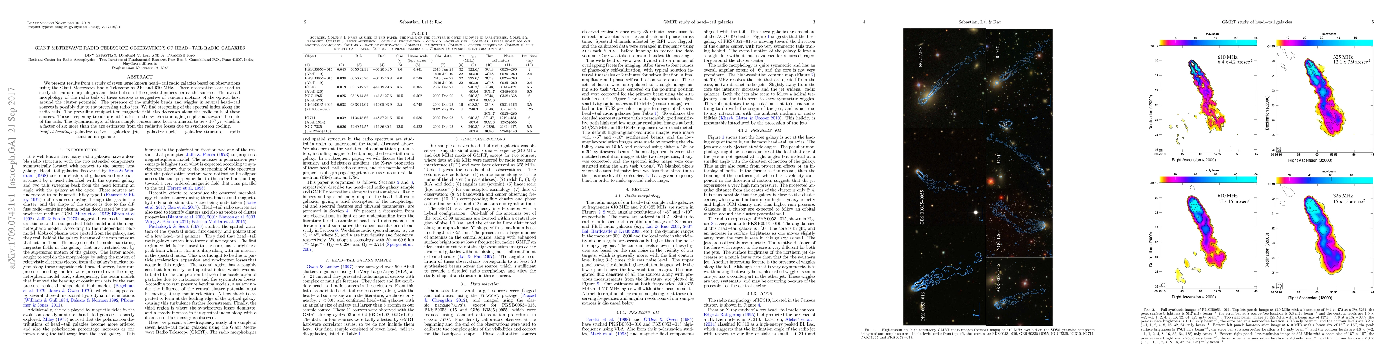 We present results from a study of seven large known head-tail radio galaxies based on observations using the Giant Metrewave Radio Telescope at 240 and 610 MHz. These observations are used to study the radio morphologies and distribution of the spectral indices across the sources. The overall morphology of the radio tails of these sources is suggestive of random motions of the optical host around the cluster potential. The presence of the multiple bends an d wiggles in several head-tail sources is possibly due to the precessing radio jets. We find steepening of the spectral index along the radio tails. The prevailing equipartition magnetic field also decreases a long the radio tails of these sources. These steepening trends are attributed to the synchrotron aging of plasma toward the ends of the tails. The dynamical ages of these sample sources have been estimated to be ~100 Myr, which is a factor of six more than the age estimates from the radiative losses due to synchrotron cooling.