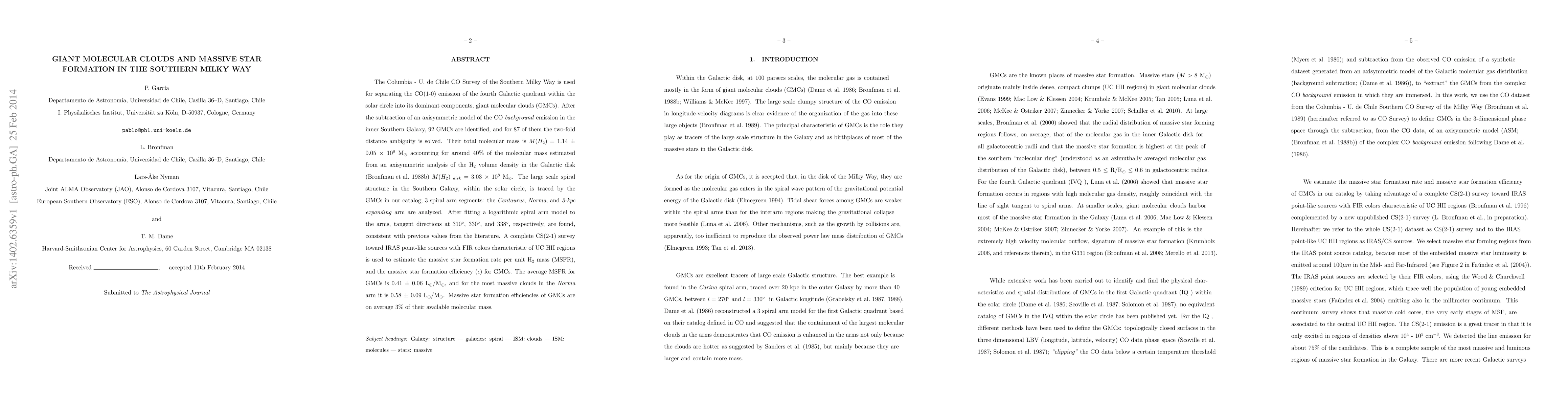 This study identifies 92 giant molecular clouds (GMCs) in the southern Milky Way, accounting for 40% of the total molecular mass in the Galactic disk, and analyzes their distribution along the large-scale spiral structure. The research estimates the massive star formation efficiency for these GMCs to be on average 3% of their available molecular mass.