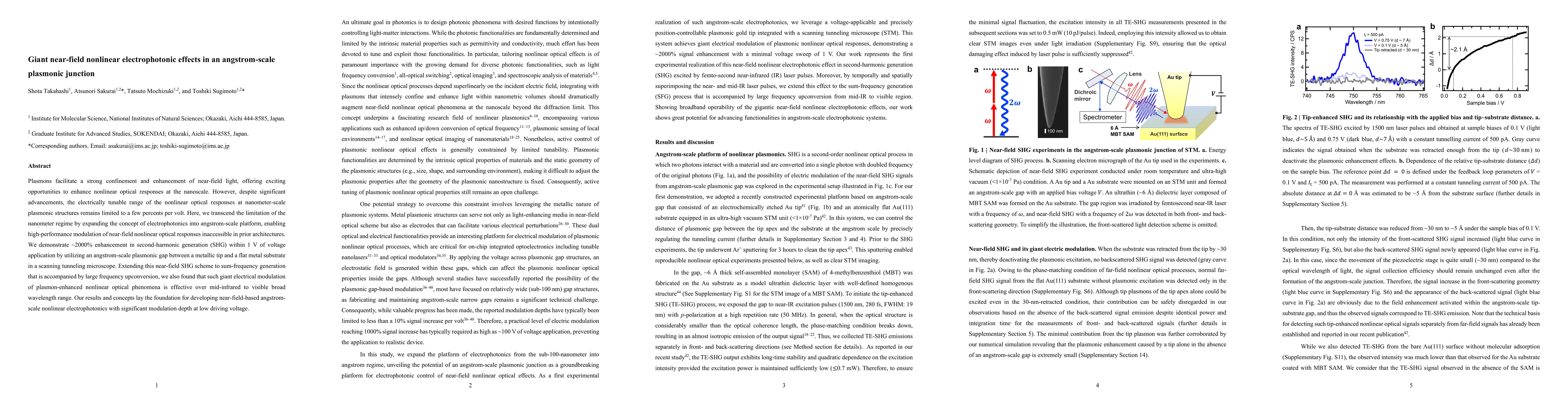 Plasmons facilitate a strong confinement and enhancement of near-field light, offering exciting opportunities to enhance nonlinear optical responses at the nanoscale. However, despite significant advancements, the electrically tunable range of the nonlinear optical responses at nanometer-scale plasmonic structures remains limited to a few percents per volt. Here, we transcend the limitation of the nanometer regime by expanding the concept of electrophotonics into angstrom-scale platform, enabling high-performance modulation of near-field nonlinear optical responses inaccessible in prior architectures. We demonstrate ~2000% enhancement in second-harmonic generation (SHG) within 1 V of voltage application by utilizing an angstrom-scale plasmonic gap between a metallic tip and a flat metal substrate in a scanning tunneling microscope. Extending this near-field SHG scheme to sum-frequency generation that is accompanied by large frequency upconversion, we also found that such giant electrical modulation of plasmon-enhanced nonlinear optical phenomena is effective over mid-infrared to visible broad wavelength range. Our results and concepts lay the foundation for developing near-field-based angstrom-scale nonlinear electrophotonics with significant modulation depth at low driving voltage.