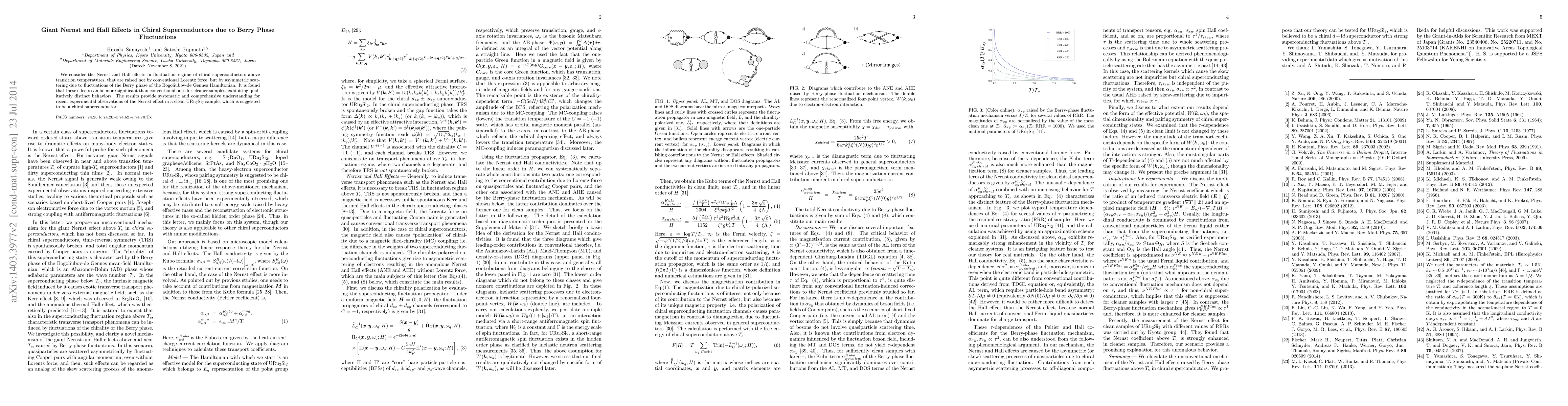 We consider the Nernst and Hall effects in fluctuation regime of chiral superconductors above transition temperatures, that are raised not by conventional Lorentz force, but by asymmetric scattering due to fluctuations of the Berry phase of the Bogoliubov-de Gennes Hamiltonian. It is found that these effects can be more significant than conventional ones for cleaner samples, exhibiting qualitatively distinct behaviors. The results provide systematic and comprehensive understanding for recent experimental observations of the Nernst effect in a clean URu$_2$Si$_2$ sample, which is suggested to be a chiral superconductor.