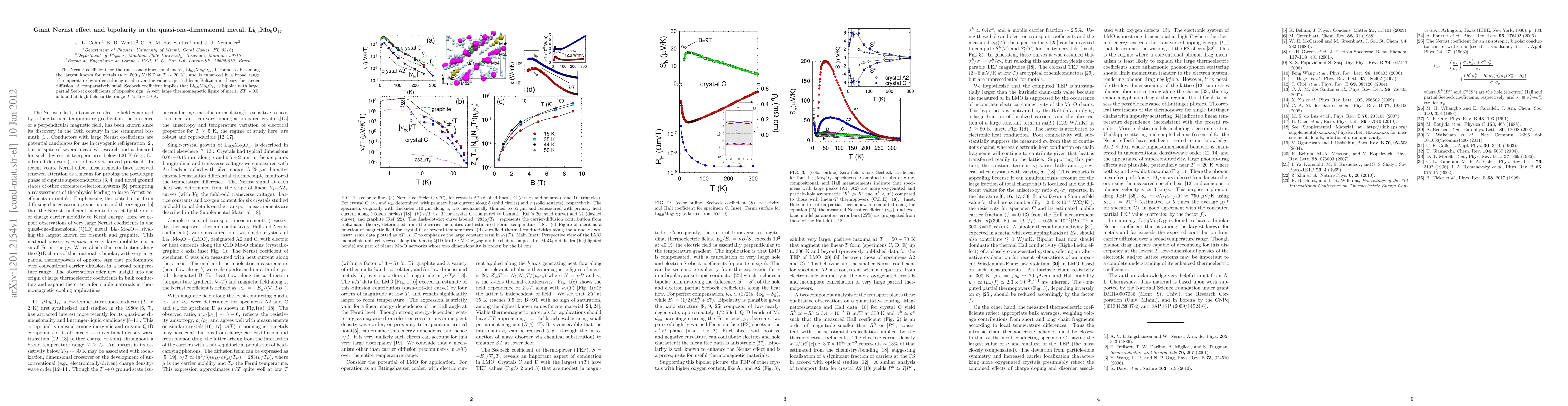 The Nernst coefficient for the quasi-one-dimensional metal, Li(0.9)Mo(6)O(17), is found to be among the largest known for metals (~500 microV/KT at T~20K), and is enhanced in a broad range of temperature by orders of magnitude over the value expected from Boltzmann theory for carrier diffusion. A comparatively small Seebeck coefficient implies that Li(0.9)Mo(6)O(17) is bipolar with large, partial Seebeck coefficients of opposite sign. A very large thermomagnetic figure of merit, ZT~0.5, is found at high field in the range T~35-50K.