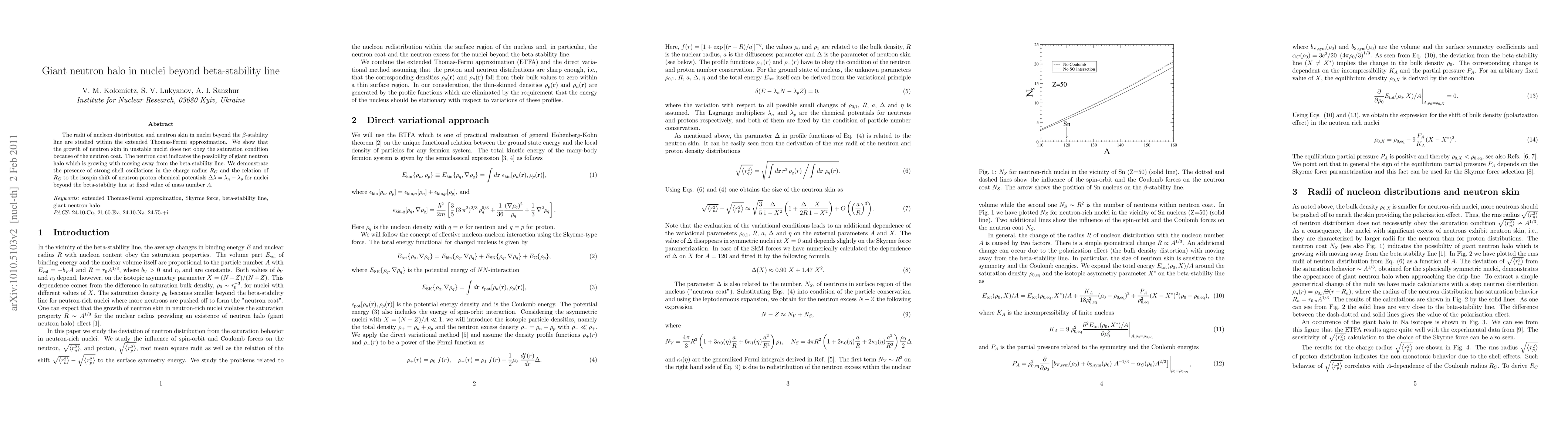 This paper investigates the neutron skin and radii of nucleon distribution in nuclei beyond the beta-stability line using the extended Thomas-Fermi approximation, revealing the presence of a giant neutron halo due to the neutron coat, which does not saturate and grows with distance from stability. It also highlights strong shell oscillations in the charge radius and its relation to the isospin shift of neutron-proton chemical potentials.