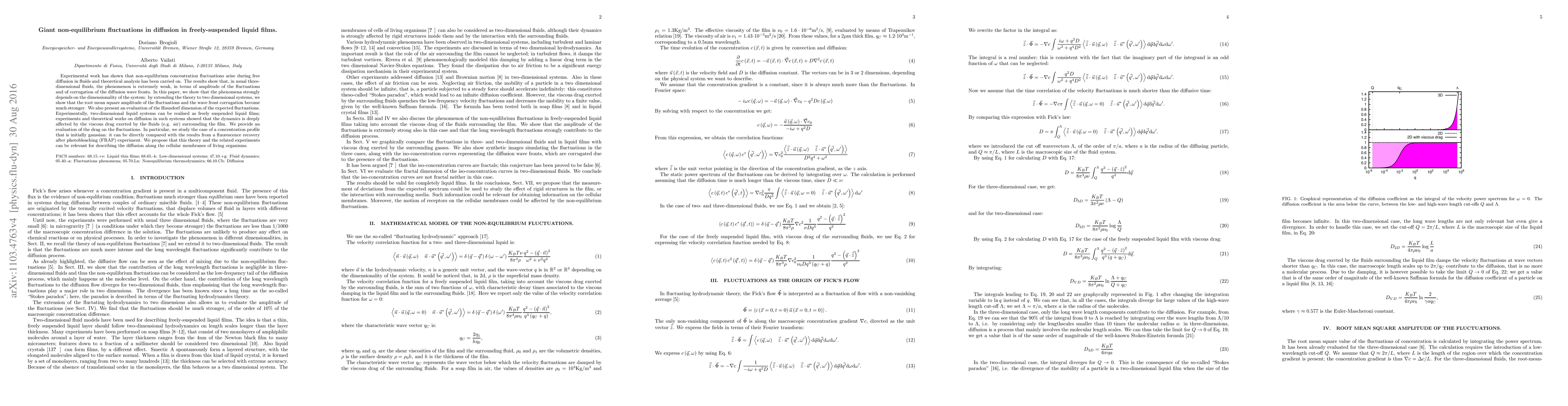 This paper investigates giant non-equilibrium fluctuations in diffusion within freely-suspended liquid films, demonstrating that these fluctuations are significantly stronger in two-dimensional systems compared to three-dimensional fluids. The study also evaluates the Hausdorff dimension of these fluctuations and the viscous drag effects, proposing relevance for understanding diffusion along cellular membranes.