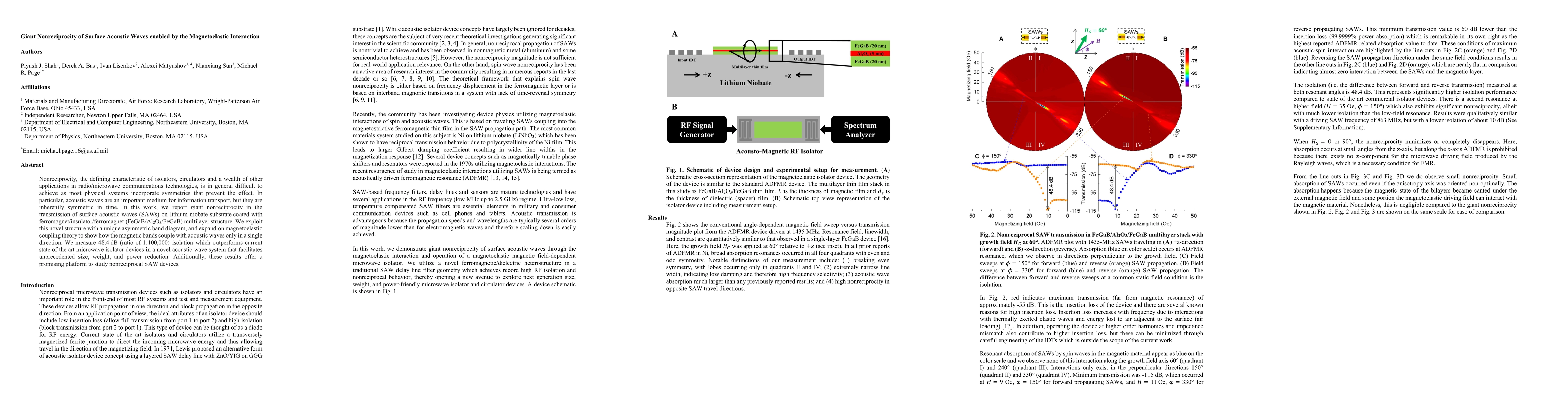 Nonreciprocity, the defining characteristic of isolators, circulators and a wealth of other applications in radio/microwave communications technologies, is in general difficult to achieve as most physical systems incorporate symmetries that prevent the effect. In particular, acoustic waves are an important medium for information transport, but they are inherently symmetric in time. In this work, we report giant nonreciprocity in the transmission of surface acoustic waves (SAWs) on lithium niobate substrate coated with ferromagnet/insulator/ferromagnet (FeGaB/Al2O3/FeGaB) multilayer structure. We exploit this novel structure with a unique asymmetric band diagram, and expand on magnetoelastic coupling theory to show how the magnetic bands couple with acoustic waves only in a single direction. We measure 48.4 dB (ratio of 1:100,000) isolation which outperforms current state of the art microwave isolator devices in a novel acoustic wave system that facilitates unprecedented size, weight, and power reduction. Additionally, these results offer a promising platform to study nonreciprocal SAW devices.