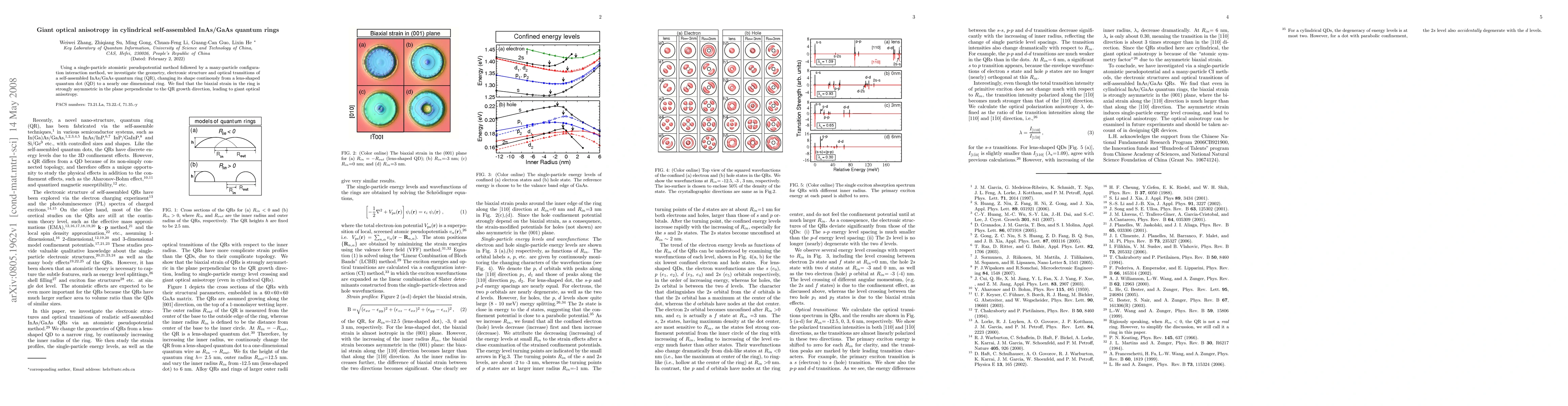The paper presents an in-depth theoretical analysis of the electronic structure and optical transitions in cylindrical self-assembled InAs/GaAs quantum rings, highlighting the significant role of biaxial strain asymmetry in generating giant optical anisotropy.