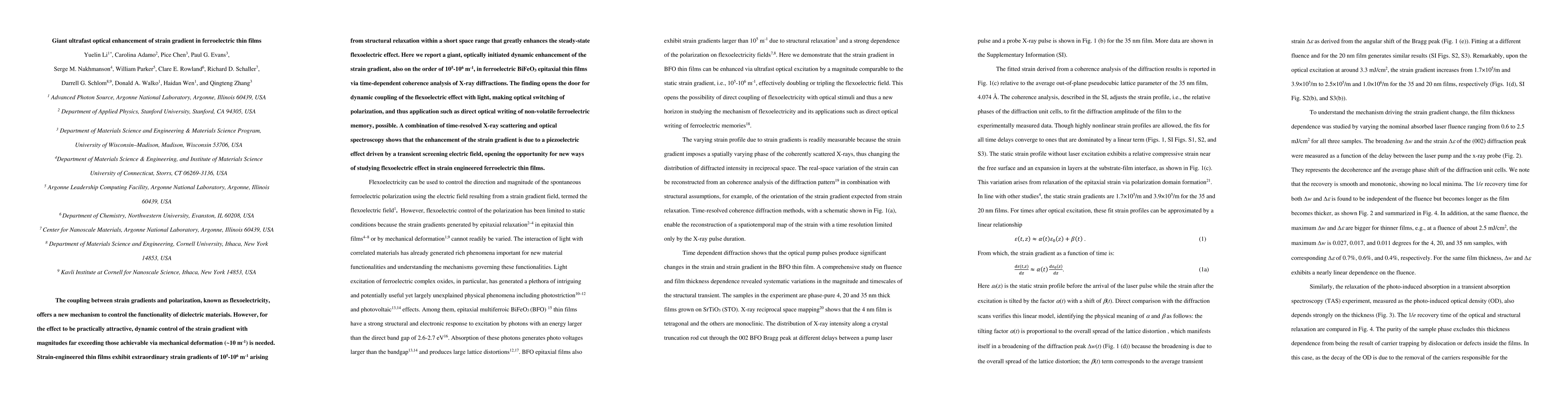 This research demonstrates a significant optical enhancement of strain gradients in ferroelectric BiFeO3 thin films, reaching $10^5-10^6 m^{-1}$, via transient electric fields, which enables dynamic coupling of the flexoelectric effect with light for potential applications in optical memory. The study utilizes time-resolved X-ray scattering and optical spectroscopy to identify the underlying piezoelectric mechanism.