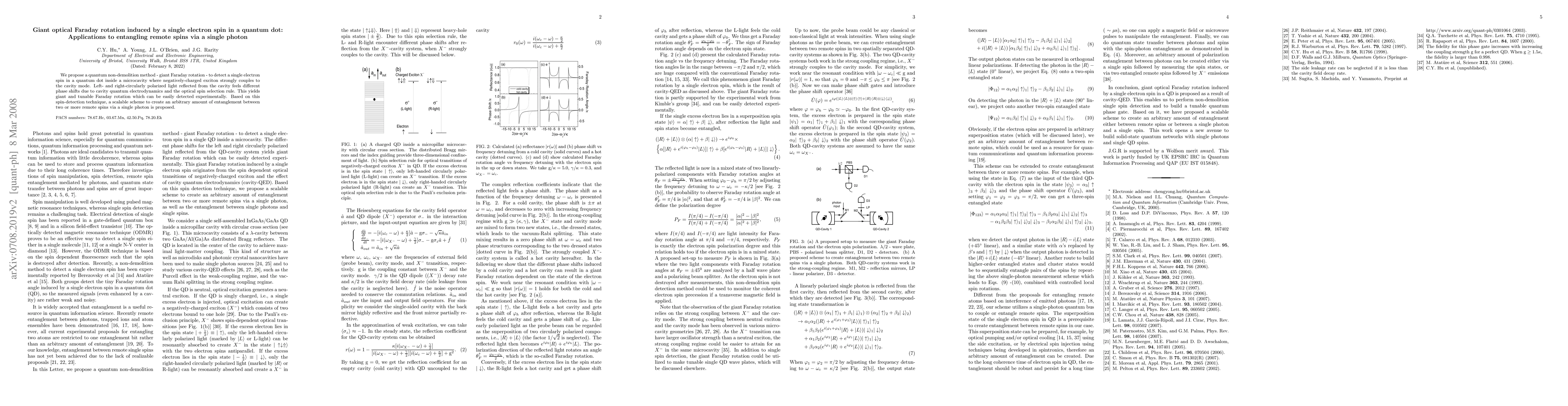 This paper proposes a quantum non-demolition method using giant Faraday rotation to detect a single electron spin in a quantum dot, leveraging microcavity-exciton coupling. The method enables scalable entanglement between remote spins via a single photon, offering potential for advanced quantum communication.