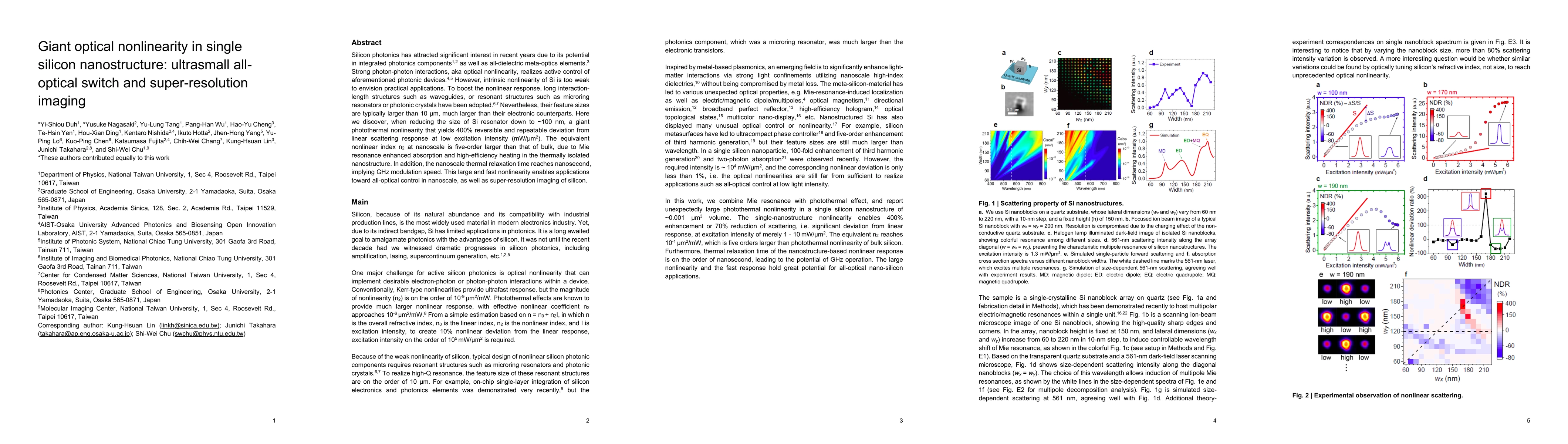This paper reports a significant enhancement in optical nonlinearity in a single silicon nanostructure, achieving a 400% deviation from linear scattering at low excitation intensity. The large nonlinear index, five orders greater than bulk silicon, is due to Mie resonance and efficient heating in the thermally isolated nanostructure, enabling ultra-small all-optical switches and super-resolution imaging.