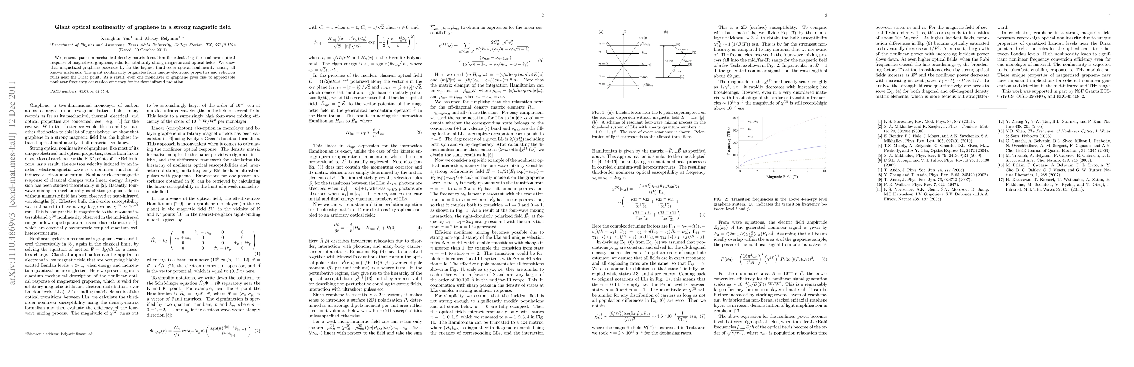 This study employs quantum-mechanical density-matrix formalism to demonstrate that magnetized graphene exhibits extraordinary third-order optical nonlinearity, surpassing all known materials. The enhanced nonlinearity arises from graphene's unique electronic properties near the Dirac point, enabling significant nonlinear frequency conversion even in a single monolayer for infrared light.