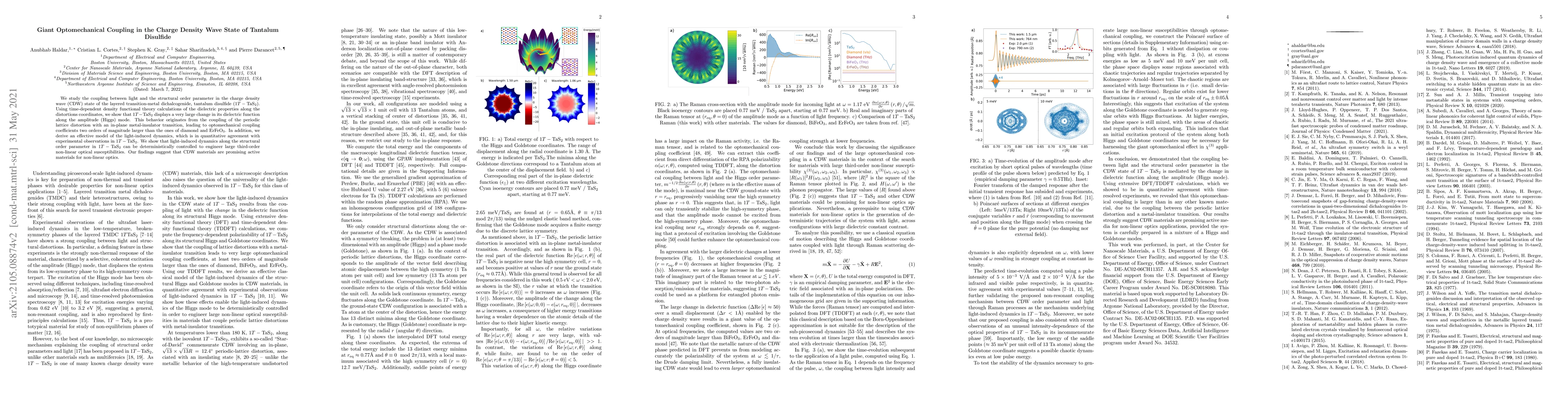 We study the coupling of light and the structural order parameter in the charge density wave (CDW) state of the layered transition-metal dichalcogenide, Tantalum Disulfide ($1T-\mathrm{TaS_2}$). Using time-dependent density functional theory calculations of the dielectric properties along the distortions coordinates, we show that $1T-\mathrm{TaS_2}$ displays very large change in its dielectric function along the amplitude (Higgs) mode due to the coupling of the periodic lattice distortion with an in-plane metal-insulator transition, leading to optomechanical coupling coefficients two orders of magnitude larger than the ones of diamond and ErFeO$_3$. In addition, we derive an effective model of the light-induced dynamics, which is in quantitative agreement with experimental observations in $1T-\mathrm{TaS_2}$. We show that light-induced dynamics of the structural order parameter in $1T-\mathrm{TaS_2}$ can be deterministically controlled to engineer large third-order non-linear optical susceptibilities. Our findings suggest that CDW materials are promising active materials for non-linear optics.