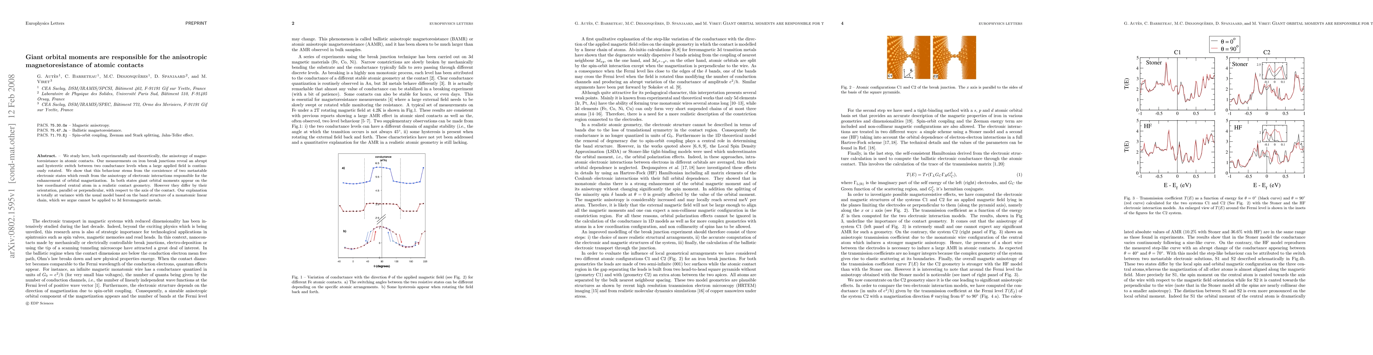 Researchers discovered that giant orbital moments in atomic contacts cause anisotropic magnetoresistance, leading to a sudden switch between two conductance levels when applying a continuous magnetic field. This behavior is attributed to the coexistence of two metastable electronic states with parallel or perpendicular orientation.