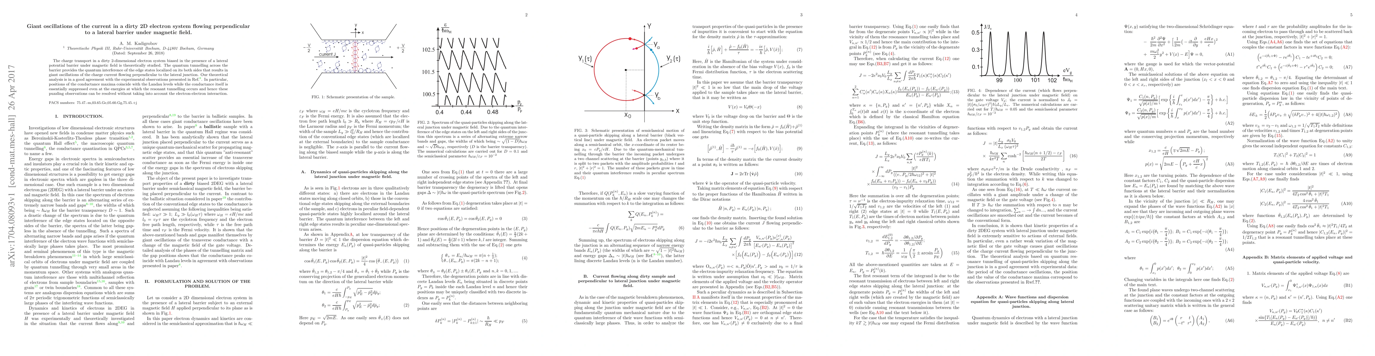 The charge transport in a dirty 2-dimensional electron system biased in the presence of a lateral potential barrier under magnetic field is theoretically studied. The quantum tunneling across the barrier provides the quantum interference of the edge states localized on its both sides that results in giant oscillations of the charge current flowing perpendicular to the lateral junction. Our theoretical analysis is in a good agreement with the experimental observations presented in Ref.8. In particular, positions of the conductance maxima coincide with the Landau levels while the conductance itself is essentially suppressed even at the energies at which the resonant tunneling occurs and hence these puzzling observations can be resolved without taking into account the electron-electron interaction.