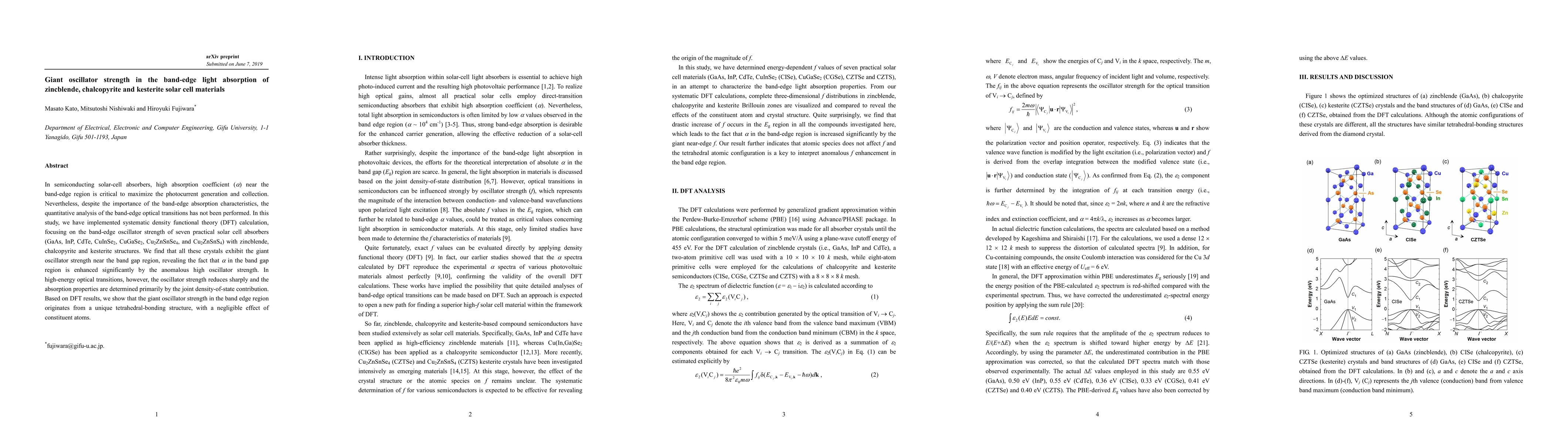 This study uses density functional theory to analyze the band-edge oscillator strength in seven solar cell materials, finding significant enhancement near the band gap due to giant oscillator strength. The high oscillator strength is attributed to a unique tetrahedral-bonding structure rather than the specific atoms involved.