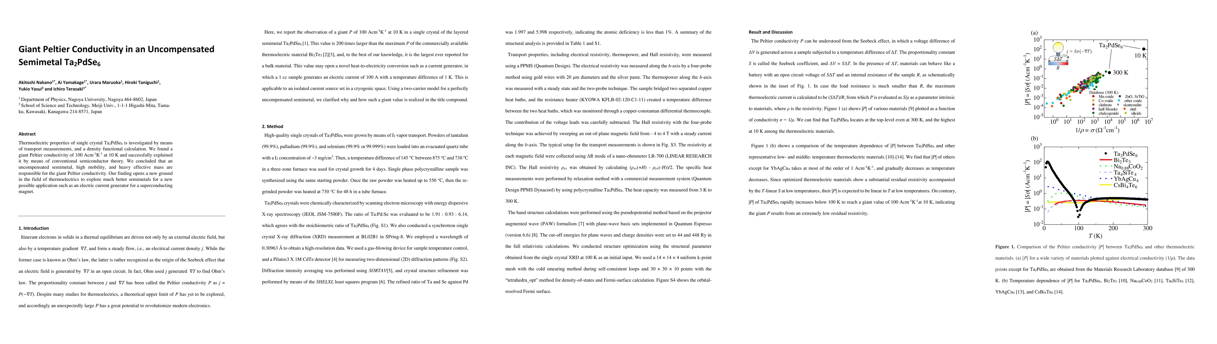 Thermoelectric properties of single crystal Ta2PdSe6 is investigated by means of transport measurements, and a density functional calculation. We found a giant Peltier conductivity of 100 Acm-1K-1 at 10 K and successfully explained it by means of conventional semiconductor theory. We concluded that an uncompensated semimetal, high mobility, and heavy effective mass are responsible for the giant Peltier conductivity. Our finding opens a new ground in the field of thermoelectrics to explore much better semimetals for a new possible application such as an electric current generator for a superconducting magnet.