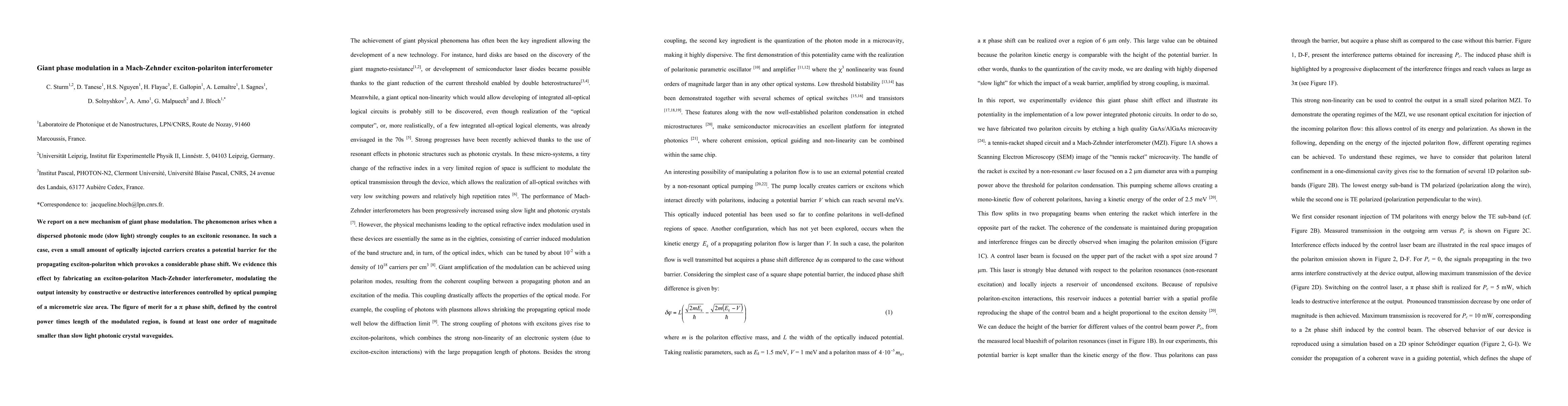 This paper reports a novel mechanism of giant phase modulation in an exciton-polariton Mach-Zehnder interferometer, where a small amount of optically injected carriers creates a potential barrier causing significant phase shifts due to the coupling of a dispersed photonic mode with an excitonic resonance. The study demonstrates a highly efficient phase modulation with a figure of merit an order of magnitude better than photonic crystal waveguides.