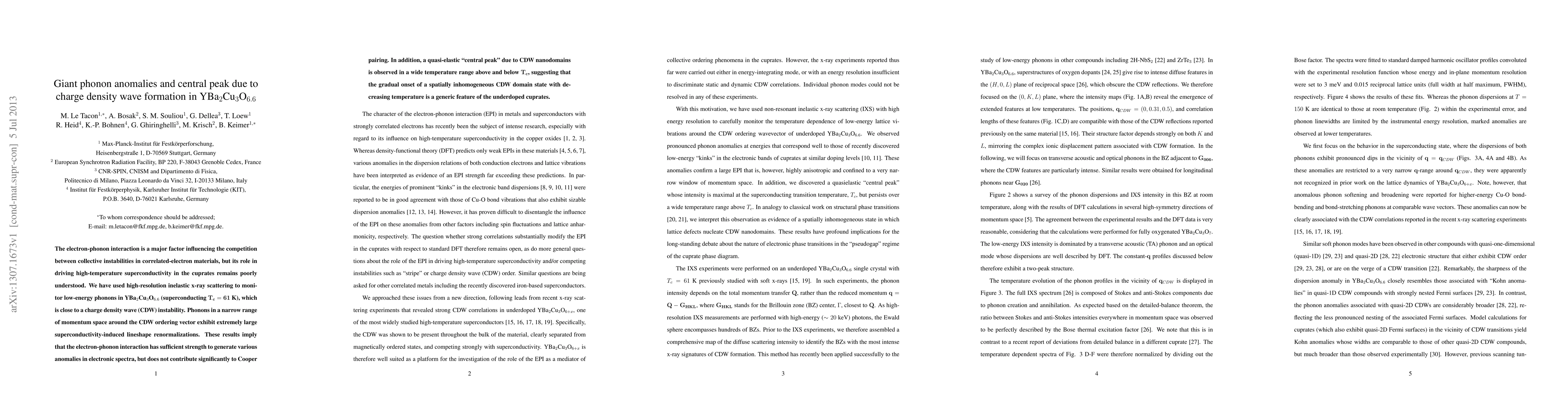 This study uses high-resolution inelastic x-ray scattering to reveal giant phonon anomalies and a central peak in YBa$_2$Cu$_3$O$_{6.6}$ near charge density wave (CDW) formation, indicating strong electron-phonon interactions but minimal contribution to Cooper pairing. A quasi-elastic central peak, due to CDW nanodomains, is observed across a wide temperature range, suggesting spatial inhomogeneity in CDW states in underdoped cuprates.