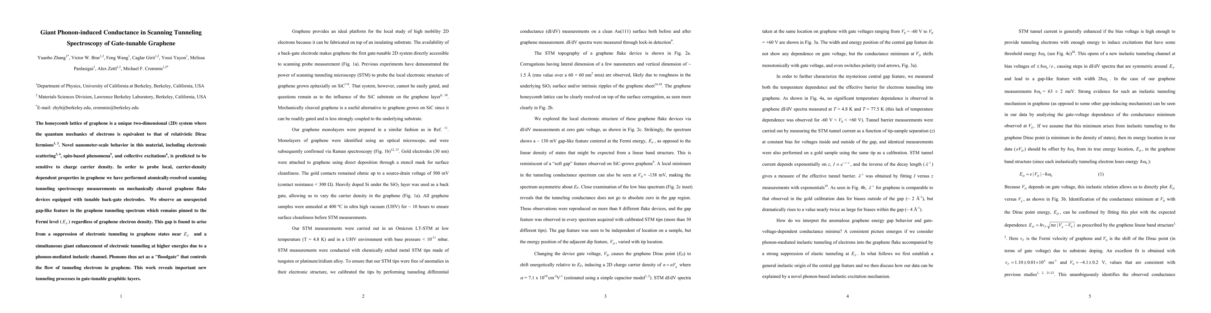 The study reveals a giant phonon-induced conductance in scanning tunneling spectroscopy of gate-tunable graphene, demonstrating a gap-like feature in the tunneling spectrum that remains fixed to the Fermi level, attributable to phonon-mediated inelastic tunneling.