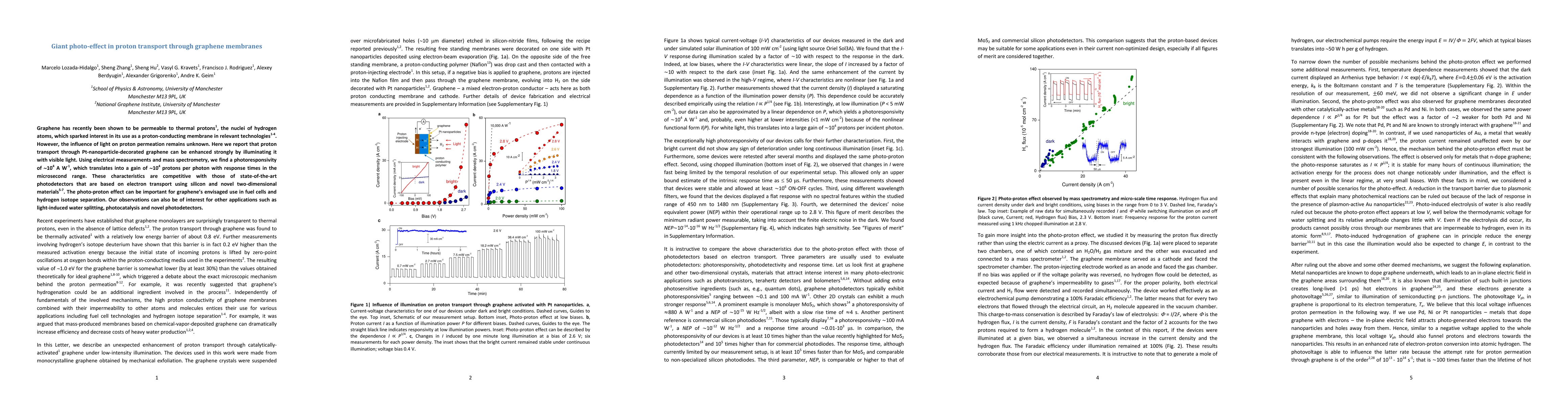 Researchers discovered that graphene membranes can enhance proton transport when illuminated with visible light, showing a strong photoresponsivity of 10^4 A W^-1 and competitive characteristics with state-of-the-art photodetectors.