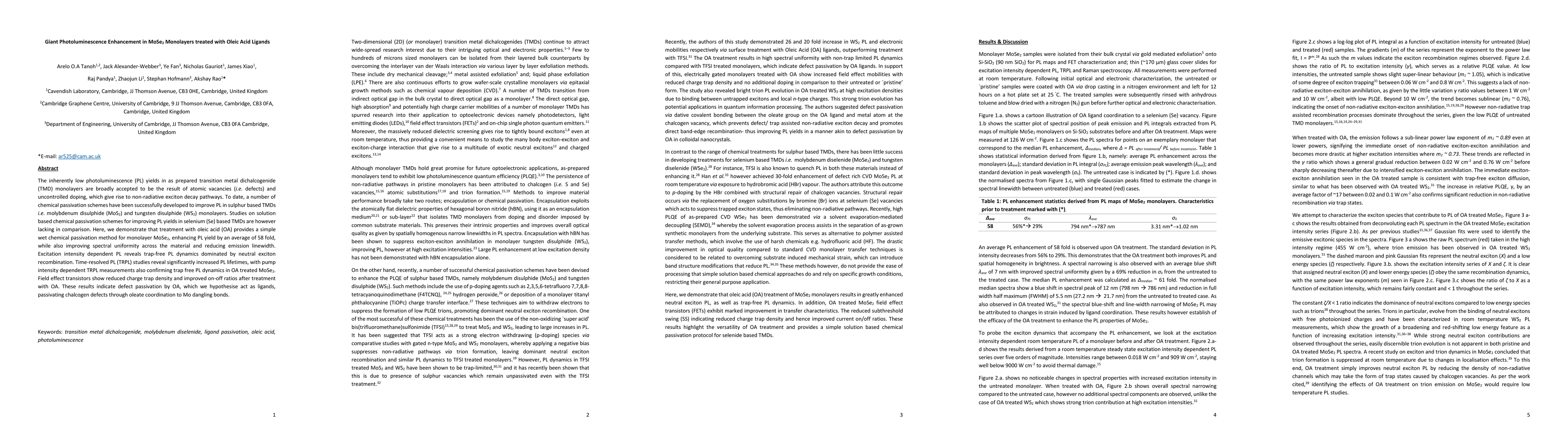 The inherently low photoluminescence (PL) yields in as prepared transition metal dichalcogenide (TMD) monolayers are broadly accepted to be the result of atomic vacancies (i.e. defects) and uncontrolled doping, which give rise to non-radiative exciton decay pathways. To date, a number of chemical passivation schemes have been successfully developed to improve PL in sulphur based TMDs i.e. molybdenum disulphide (MoS2) and tungsten disulphide (WS2) monolayers. Reports on solution based chemical passivation schemes for improving PL yields in selenium (Se) based TMDs are lacking I comparison, with only one known study that uses hydrobromic acid vapour to improve PL in chemical vapour deposited (CVD) Molybdenum diselenide (MoSe2). Here, we demonstrate that treatment with oleic acid (OA) provides a simple wet chemical passivation method for monolayer MoSe2, enhancing PL yield by an average of 58 fold, while also enhancing spectral uniformity across the material and reducing emission linewidth. Excitation intensity dependent PL reveals trap-free PL dynamics dominated by neutral exciton recombination. Time-resolved PL (TRPL) studies reveal significantly increased PL lifetimes, with pump intensity dependent TRPL measurements also confirming trap free PL dynamics in OA treated MoSe2. Field effect transistors show reduced charge trap density and improved on-off ratios after treatment with OA. These results indicate defect passivation by OA, which we hypothesise act as ligands, passivating chalcogen defects through oleate coordination to Mo dangling bonds.