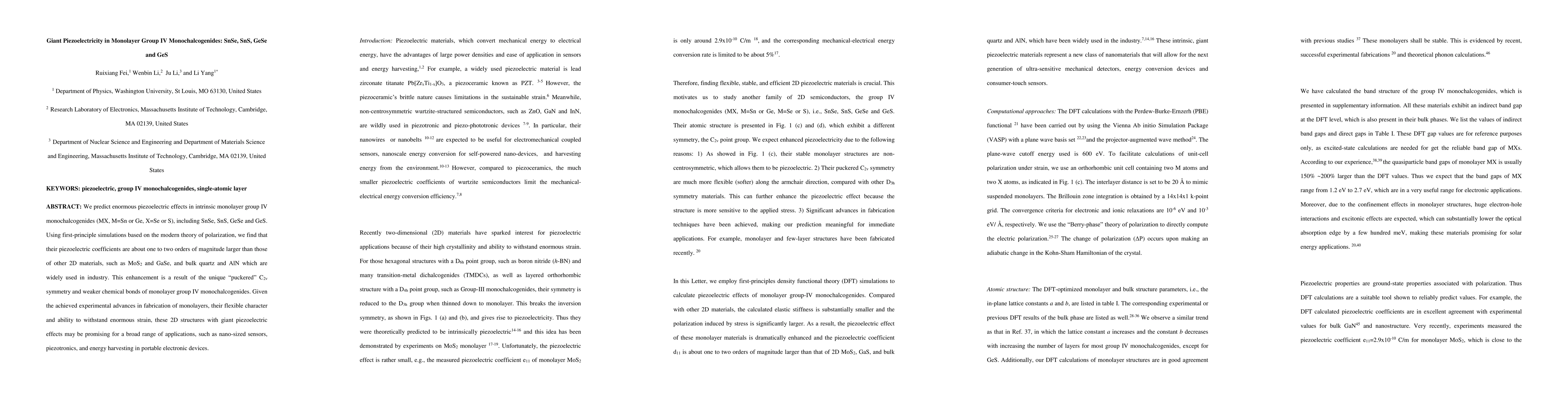This paper predicts significant piezoelectric effects in monolayer group IV monochalcogenides, including SnSe, SnS, GeSe, and GeS, with coefficients two orders of magnitude greater than conventional materials. These enhanced effects are due to their unique "puckered" symmetry and weaker bonds, potentially enabling applications in nano-sensors, piezotronics, and energy harvesting.