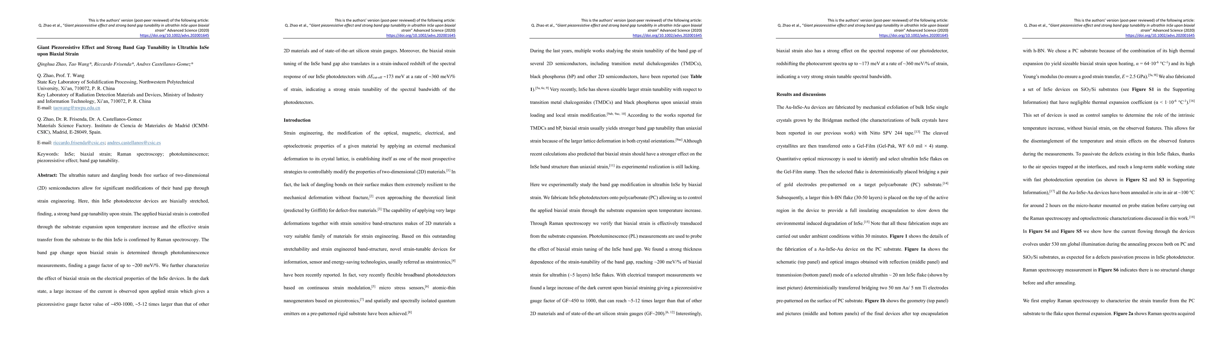 This paper investigates the giant piezoresistive effect and strong band gap tunability in ultrathin InSe under biaxial strain. The study finds a significant piezoresistive gauge factor of ~450-1000, and a band gap change of up to ~200 meV/% with a strain-induced redshift of the spectral response by ~360 meV/%.