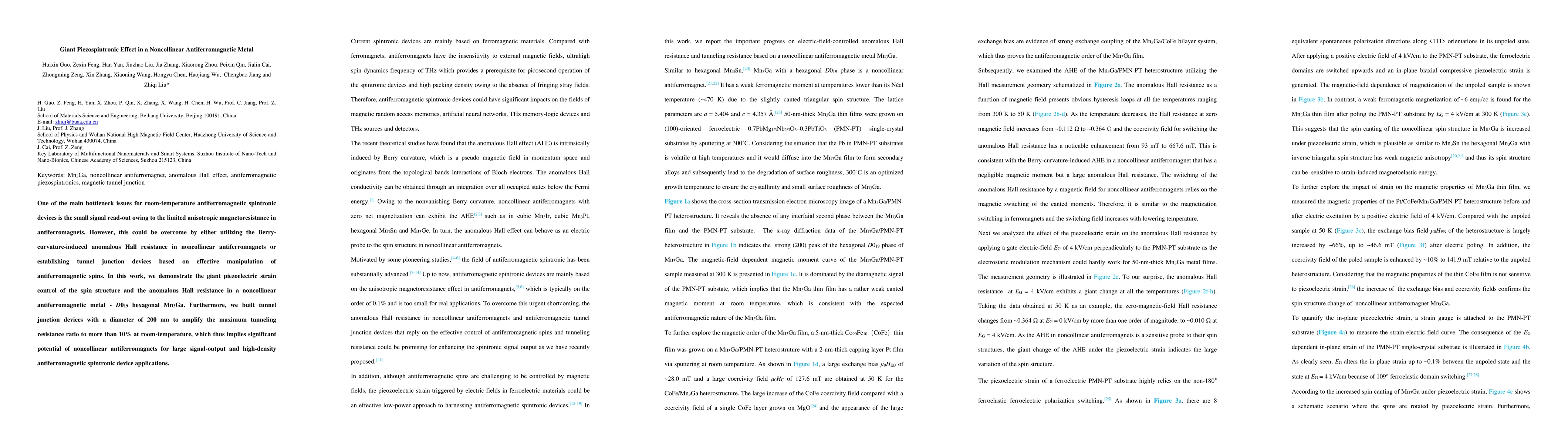 This paper demonstrates a giant piezospintronic effect in the noncollinear antiferromagnetic metal Mn3Ga, showing significant control over spin structure and anomalous Hall resistance via piezoelectric strain. The study also developed tunnel junction devices that achieve a maximum tunneling resistance ratio of over 10% at room temperature, indicating promising potential for high-density, large signal-output antiferromagnetic spintronic devices.