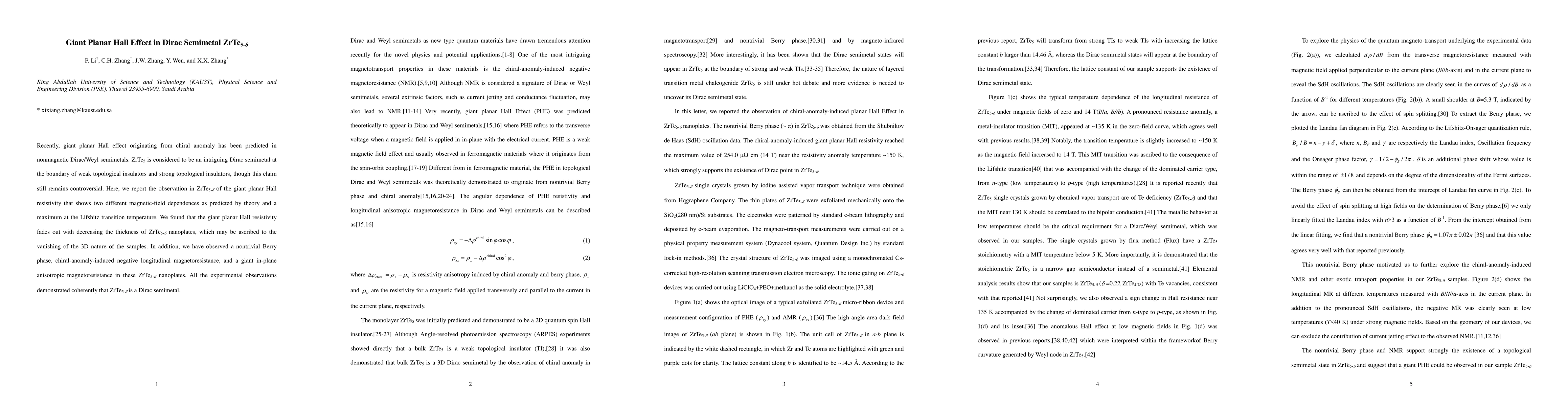 This paper reports the observation of a giant planar Hall effect in ZrTe5, a Dirac semimetal, which exhibits different magnetic-field dependencies and peaks at the Lifshitz transition temperature, confirming its Dirac semimetal nature and demonstrating its topological properties through various magnetoresistance phenomena.