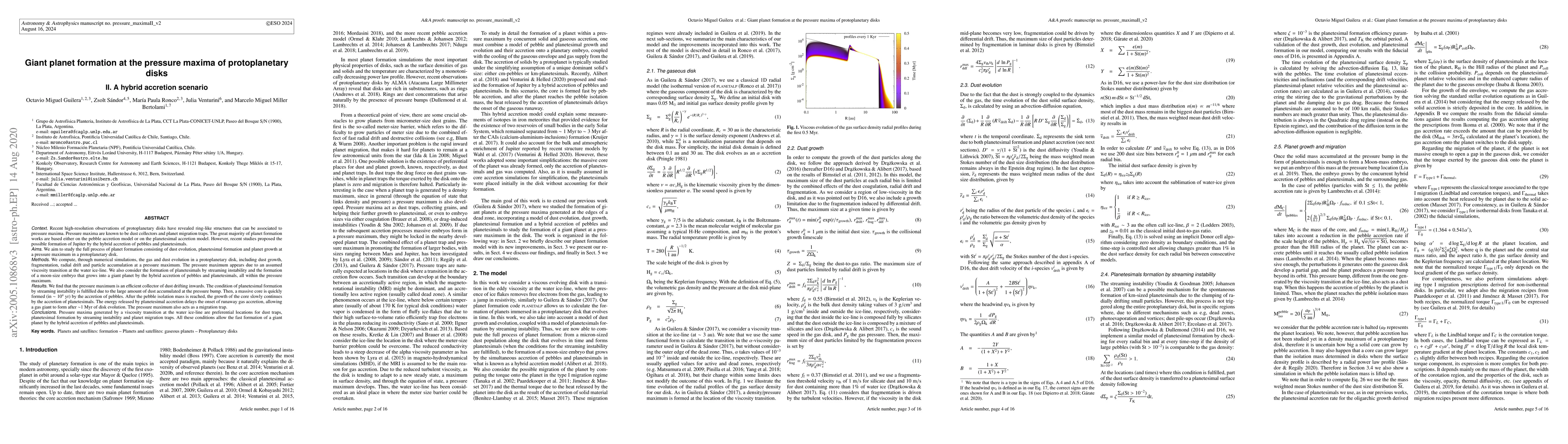 This paper investigates the formation of giant planets at pressure maxima in protoplanetary disks through a hybrid accretion model combining pebble and planetesimal growth. Numerical simulations show that pressure maxima efficiently collect dust and facilitate planetesimal formation, leading to the rapid formation of a gas giant via a combination of pebble accretion and planetesimal accretion over a million years.
