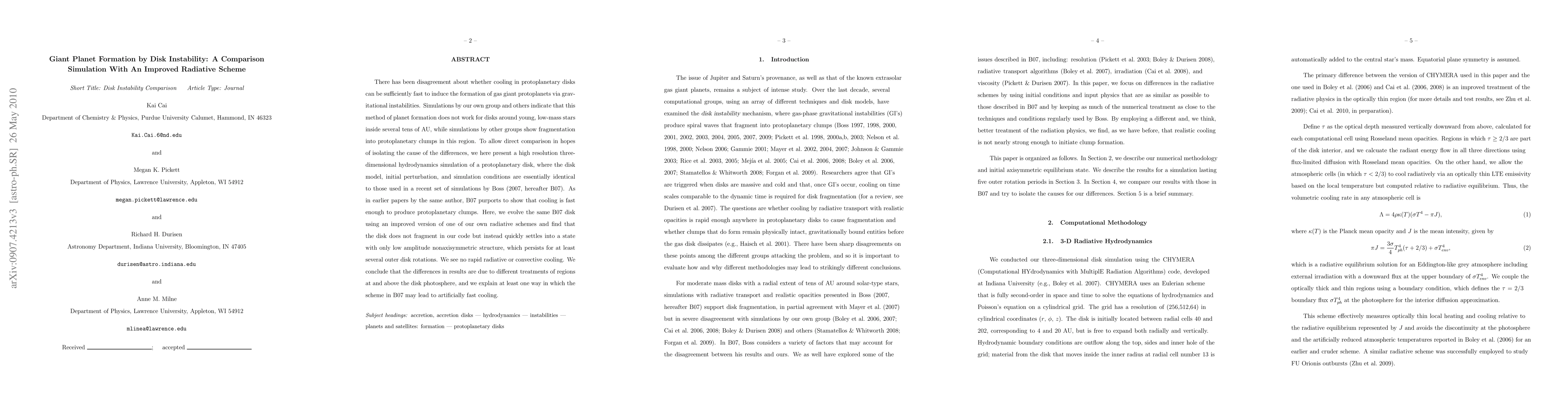 Researchers compared simulations of giant planet formation via disk instability, finding that a new radiative scheme led to slow cooling and no fragmentation, contradicting earlier results. The study suggests different treatment of regions above the disk photosphere may be responsible for these differences.
