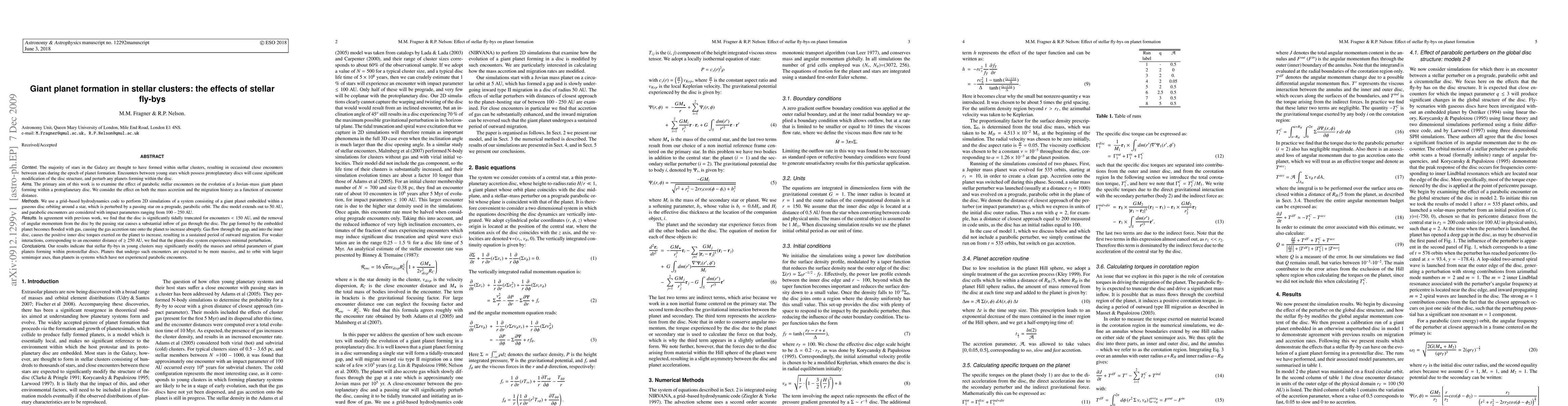 This study investigates how parabolic stellar fly-bys affect the formation of giant planets in protoplanetary discs, finding that close encounters (<150 AU) significantly increase gas accretion and cause outward migration, while more distant encounters (>250 AU) have minimal impact.