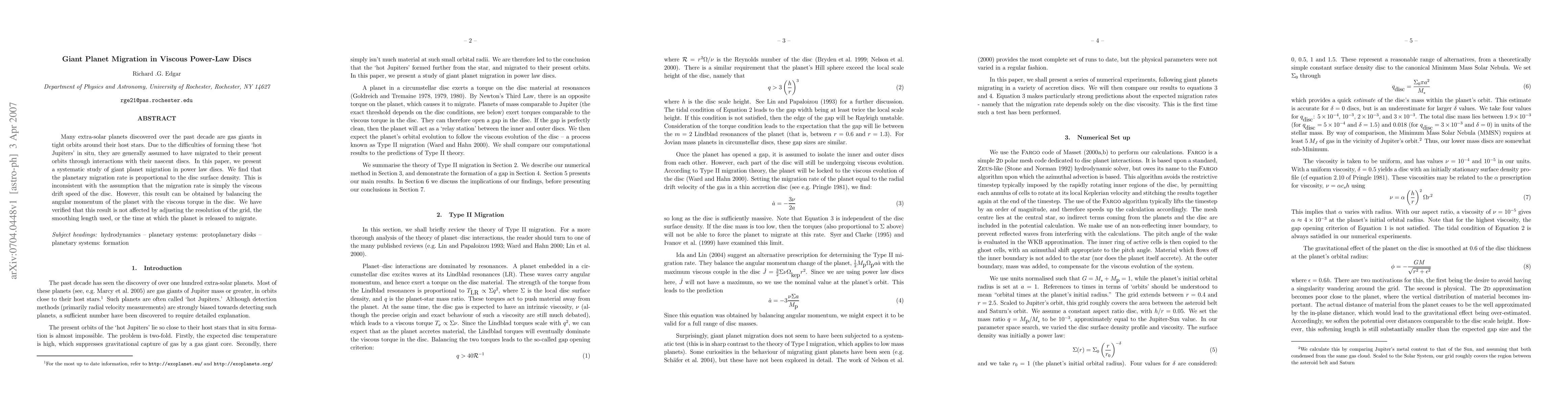 This paper investigates giant planet migration in viscous power-law discs, finding that the migration rate is proportional to the disc's surface density rather than the viscous drift speed. The study concludes that this migration behavior results from balancing the planet's angular momentum with the disc's viscous torque.