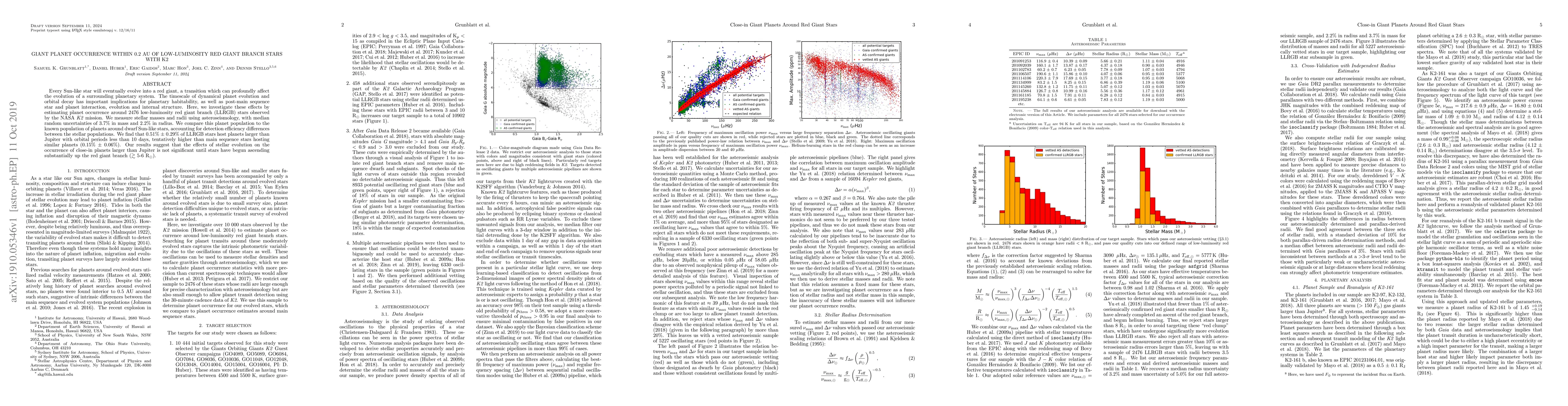 This study investigates the occurrence of giant planets within 0.2 AU of low-luminosity red giant branch stars using K2 data, finding that 0.51% of these stars host Jupiter-sized planets with short orbital periods, suggesting a higher occurrence than around main sequence stars. The results imply minimal impact on planet occurrence until stars significantly evolve into red giants.