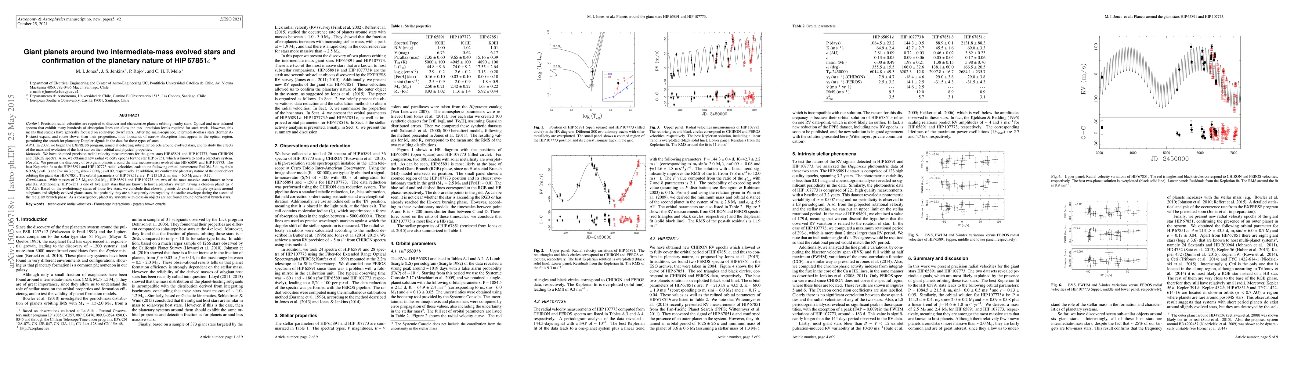This paper reports the discovery of two giant planets orbiting the intermediate-mass evolved stars HIP65891 and HIP107773, and confirms the planetary nature of the planet HIP67851c. The findings suggest that such stars can host planets, challenging previous assumptions that only solar-type dwarfs could.