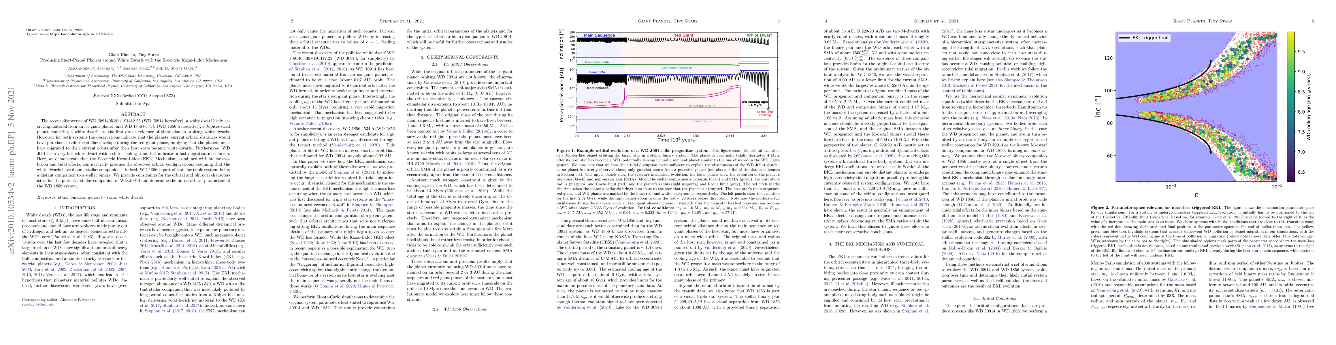The recent discoveries of WD J091405.30+191412.25 (WD J0914 hereafter), a white dwarf likely accreting material from an ice giant planet, and WD 1856+534 b (WD 1856 b hereafter), a Jupiter-sized planet transiting a white dwarf, are the first direct evidence of giant planets orbiting white dwarfs. However, for both systems the observations indicate that the planets' current orbital distances would have put them inside the stellar envelope during the red giant phase, implying that the planets must have migrated to their current orbits after their host stars became white dwarfs. Furthermore, WD J0914 is a very hot white dwarf with a short cooling time that indicates a fast migration mechanism. Here, we demonstrate that the Eccentric Kozai-Lidov (EKL) Mechanism, combined with stellar evolution and tidal effects, can naturally produce the observed orbital configurations, assuming that the white dwarfs have distant stellar companions. Indeed, WD 1856 is part of a stellar triple system, being a distant companion to a stellar binary. We provide constraints for the orbital and physical characteristics for the potential stellar companion of WD J0914 and determine the initial orbital parameters of the WD 1856 system.