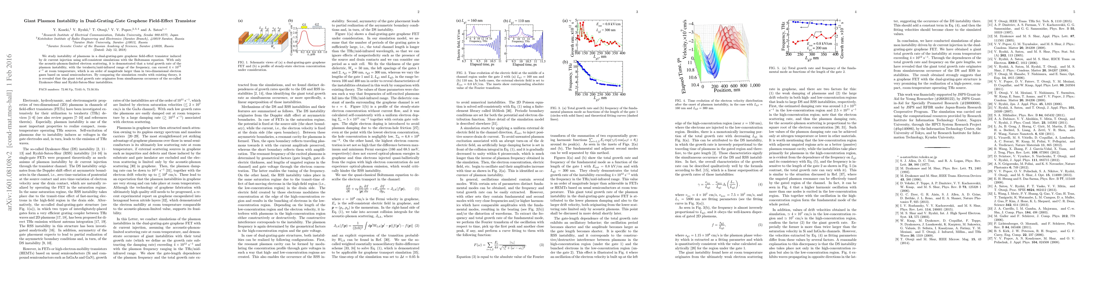 The paper presents a detailed analysis of plasmon instability in dual-grating-gate graphene FETs, identifying the simultaneous occurrence of DS and RSS instabilities as the source of giant total growth rate.