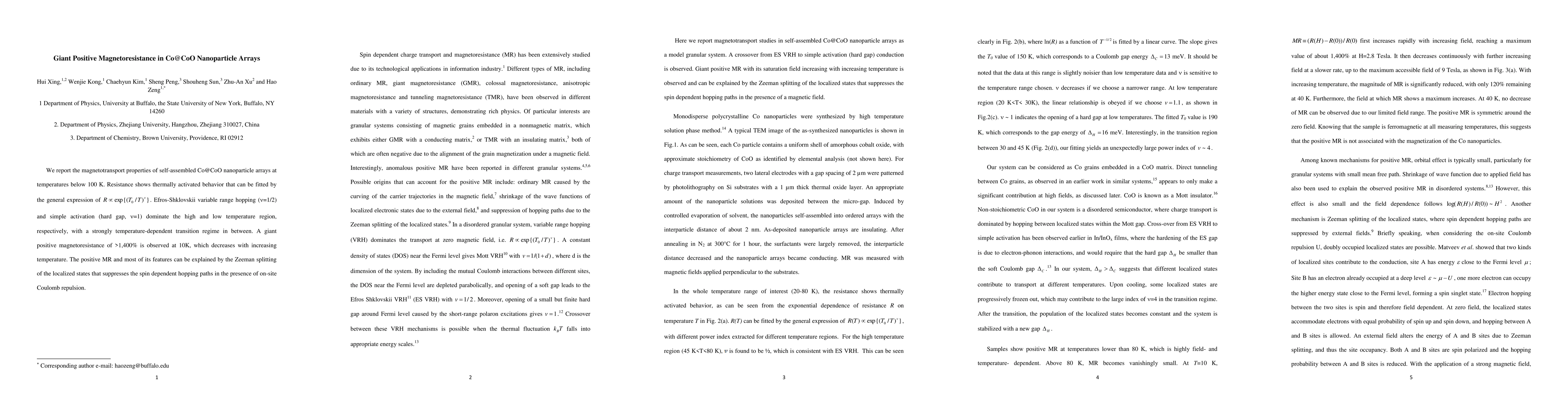 This paper investigates the magnetotransport properties of Co@CoO nanoparticle arrays, revealing a giant positive magnetoresistance of over 1,400% at 10K, attributed to the suppression of spin-dependent hopping paths due to Zeeman splitting in the presence of Coulomb repulsion. The resistance exhibits thermally activated behavior, transitioning from Efros-Shklovskii variable range hopping to simple activation with temperature.
