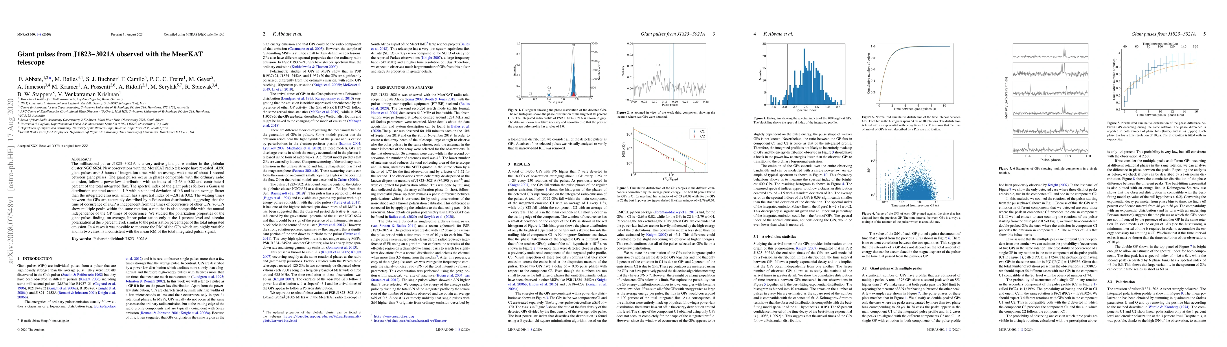 The millisecond pulsar J1823-3021A is a very active giant pulse emitter in the globular cluster NGC 6624. New observations with the MeerKAT radio telescope have revealed 14350 giant pulses over 5 hours of integration time, with an average wait time of about 1 second between giant pulses. The giant pulses occur in phases compatible with the ordinary radio emission, follow a power-law distribution with an index of -2.63 $\pm$ 0.02 and contribute 4 percent of the total integrated flux. The spectral index of the giant pulses follows a Gaussian distribution centered around -1.9 with a standard deviation of 0.6 and is on average flatter than the integrated emission, which has a spectral index of -2.81 $\pm$ 0.02. The waiting times between the GPs are accurately described by a Poissonian distribution, suggesting that the time of occurrence of a GP is independent from the times of occurrence of other GPs. 76 GPs show multiple peaks within the same rotation, a rate that is also compatible with the mutual independence of the GP times of occurrence. We studied the polarization properties of the giant pulses finding, on average, linear polarization only at the 1 percent level and circular polarization at the 3 percent level, similar to the polarization percentages of the total integrated emission. In 4 cases it was possible to measure the RM of the GPs which are highly variable and, in two cases, is inconsistent with the mean RM of the total integrated pulsar signal.