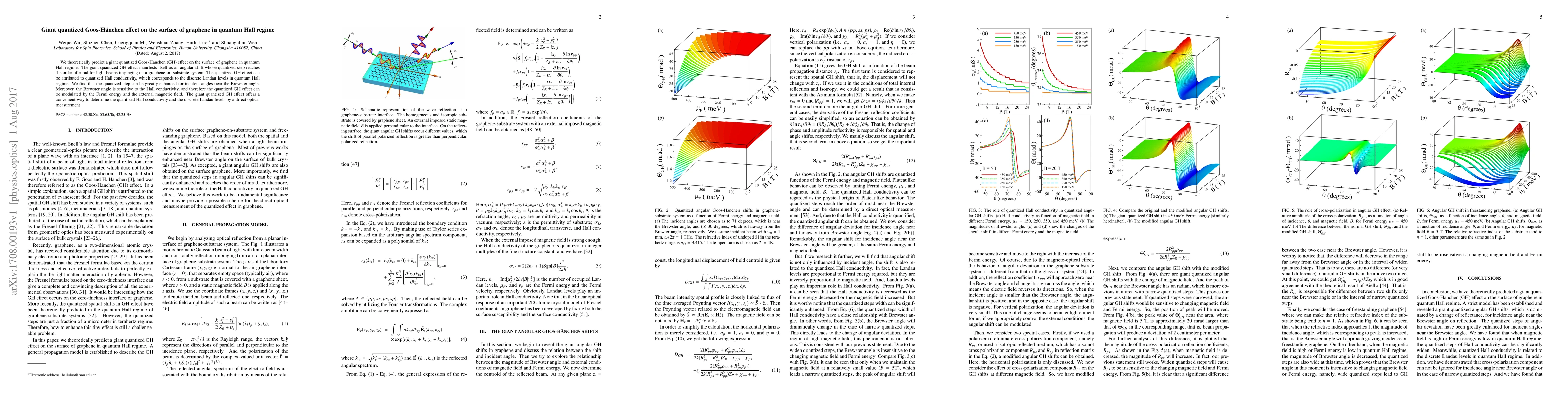 This paper theoretically predicts a giant quantized Goos-Hänchen effect on graphene in the quantum Hall regime, showing an angular shift of light beams reaching mrad order. The effect is enhanced near the Brewster angle and can be modulated by Fermi energy and magnetic field, offering a direct optical method to measure quantized Hall conductivity and discrete Landau levels.
